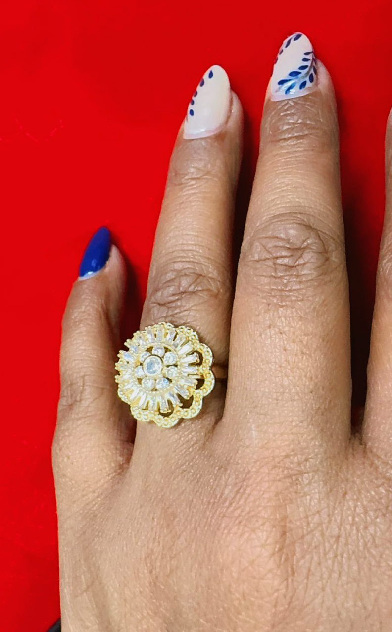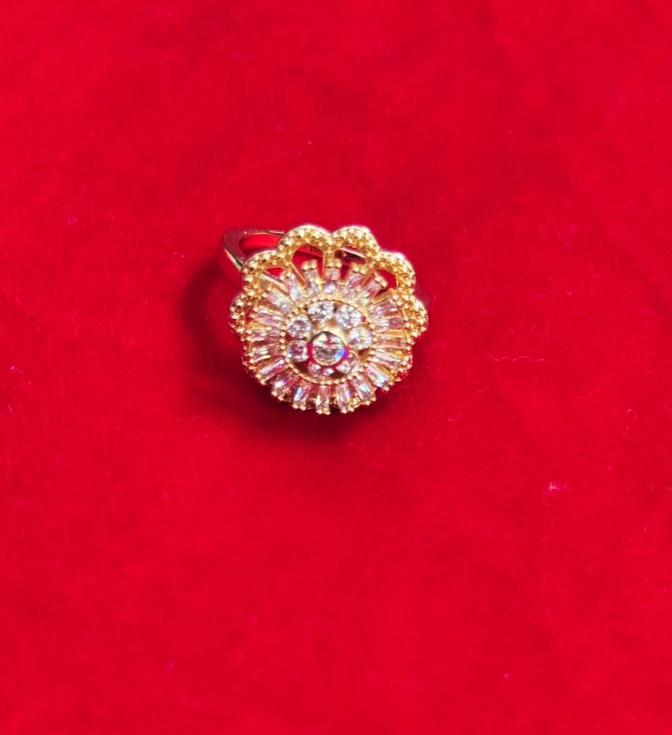 Make a bold yet elegant statement with this intricately designed spinning finger ring. Crafted in a radiant gold-toned finish, the ring features a dazzling circular centerpiece adorned with sparkling white stones, arranged in a sunburst pattern. What sets this piece apart is its rotating (spinning) feature—adding both visual charm and a playful touch of motion that captivates at every glance. The scalloped border and fine detailing elevate its grandeur, making it a conversation starter.