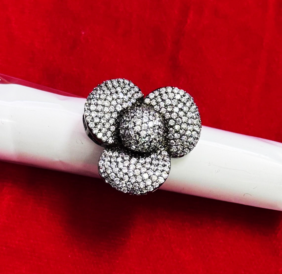 This stunning finger ring is a showstopper, featuring a glamorous floral design encrusted with shimmering white crystals. Each petal is meticulously paved with stones, creating a rich, luxurious texture that reflects light from every angle. The raised center adds dimension and depth, giving the ring a sculptural elegance. Crafted for statement appeal, this adjustable ring brings together the grace of floral motifs with high-octane sparkle — perfect for both festive and formal occasions.