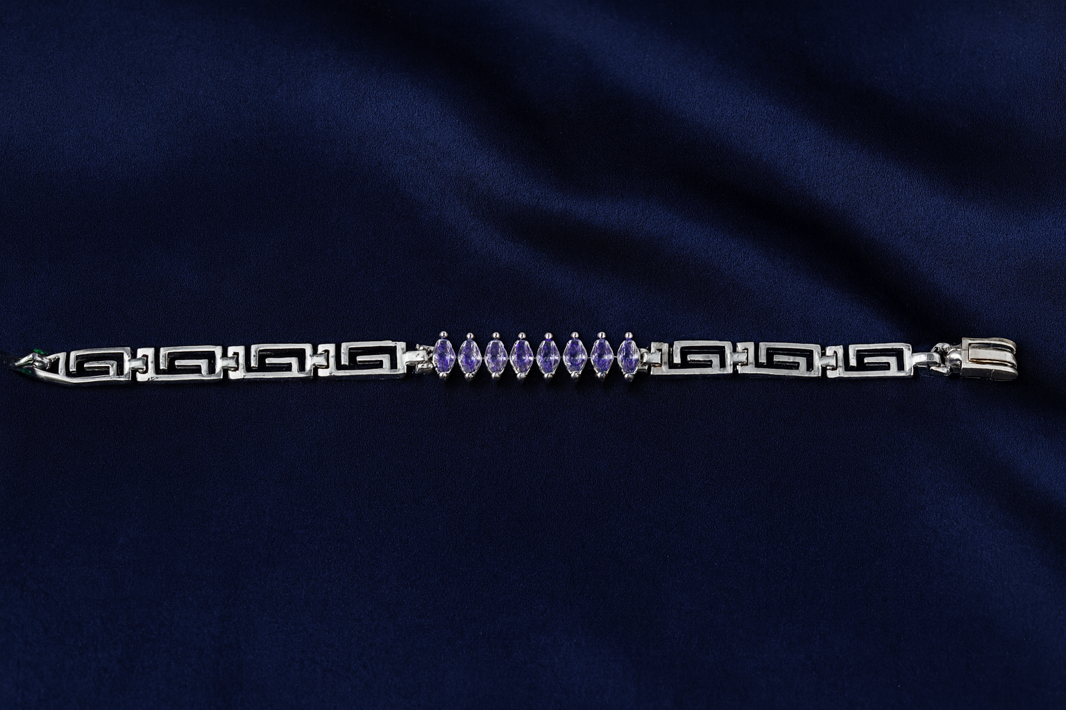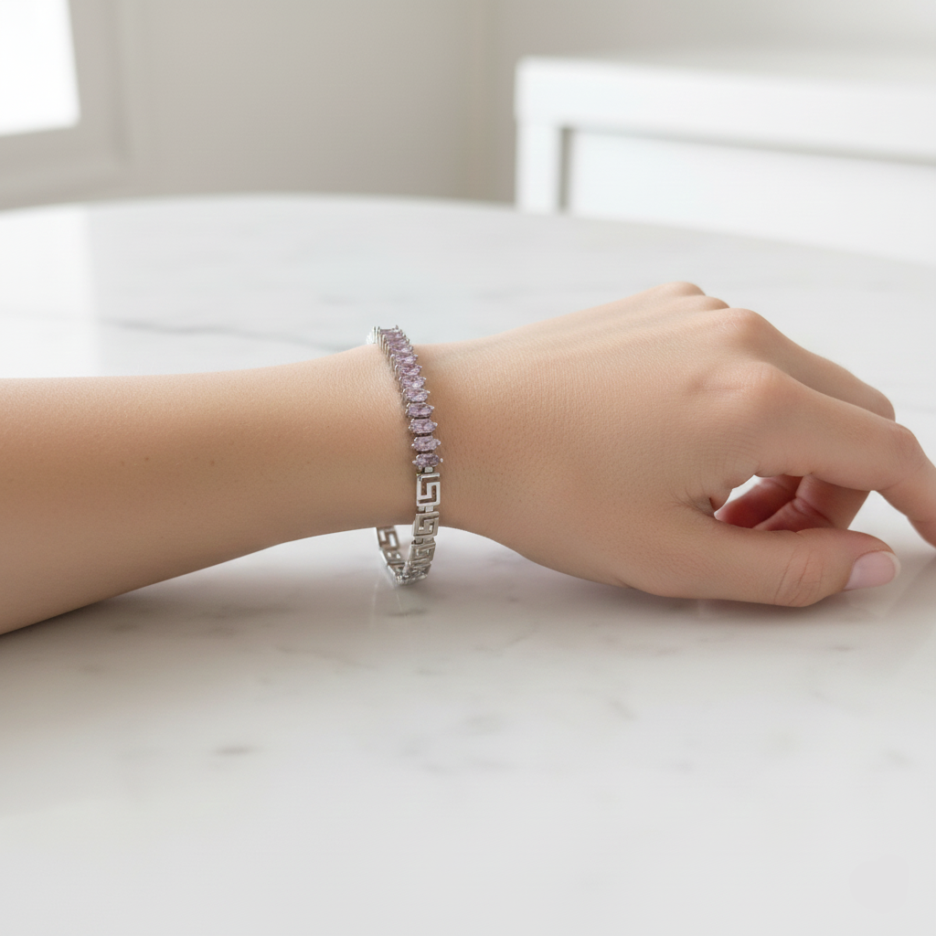 The Amethyst Greek Majesty Bracelet features a stunning combination of intricate Greek-key patterned links and a row of marquise-cut purple stones that add a regal charm. Crafted with a polished silver finish, this bracelet delivers both elegance and bold character. Its lightweight structure and luxurious shine make it suitable for both daily wear and special occasions. The secure clasp ensures a comfortable and reliable fit for all-day elegance.