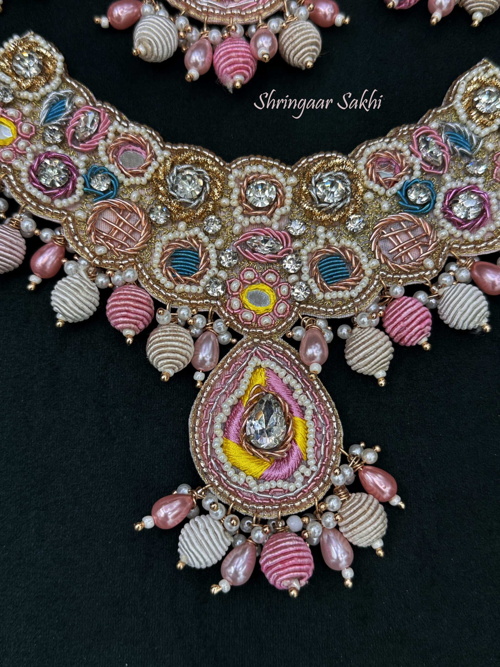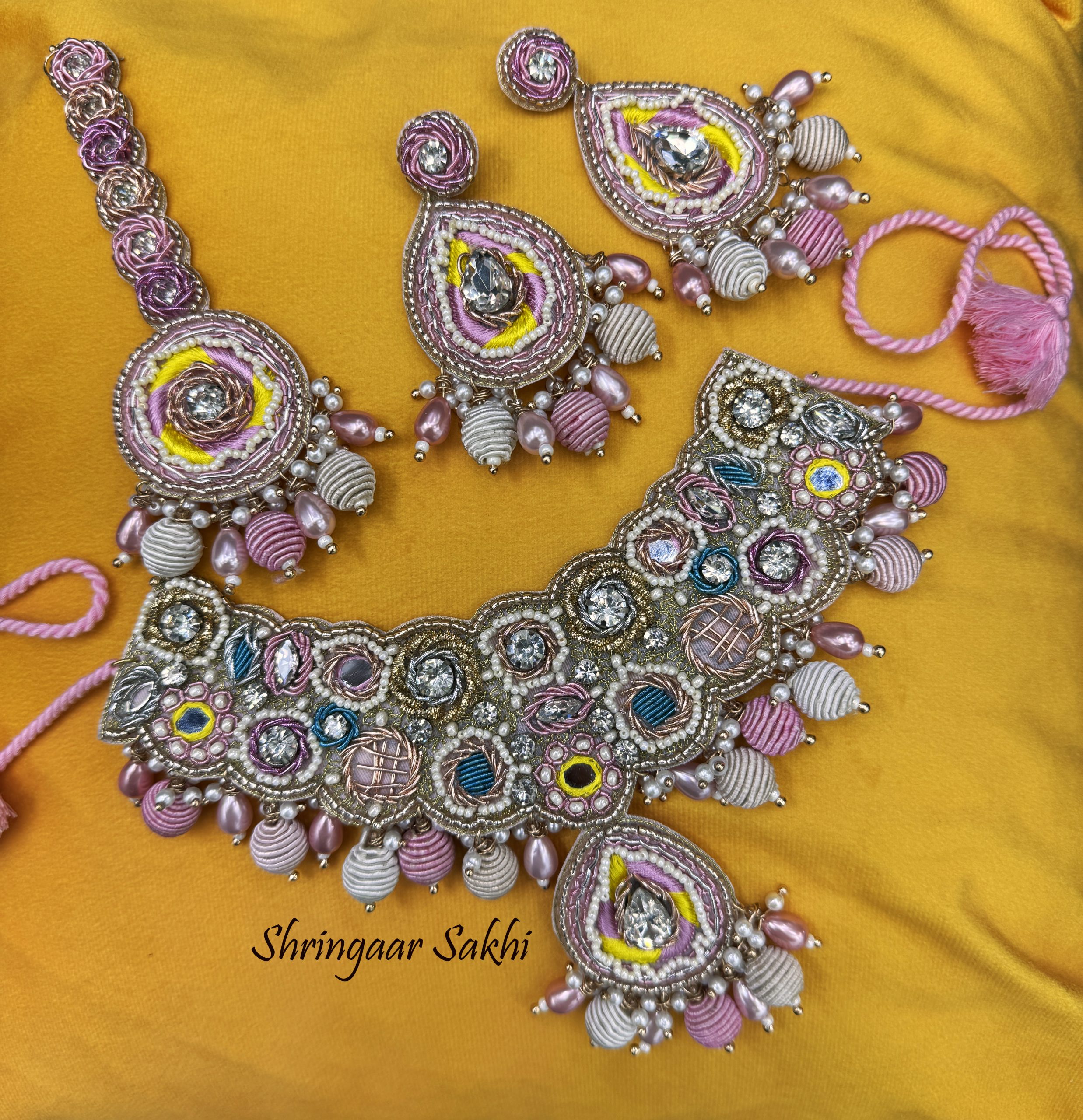 This jewellery set features a unique handcrafted design with vibrant embroidery and beadwork in shades of pink, yellow, and gold. The set includes a statement necklace, matching earrings, and a maang tikka, all embellished with intricate threadwork and beaded accents.