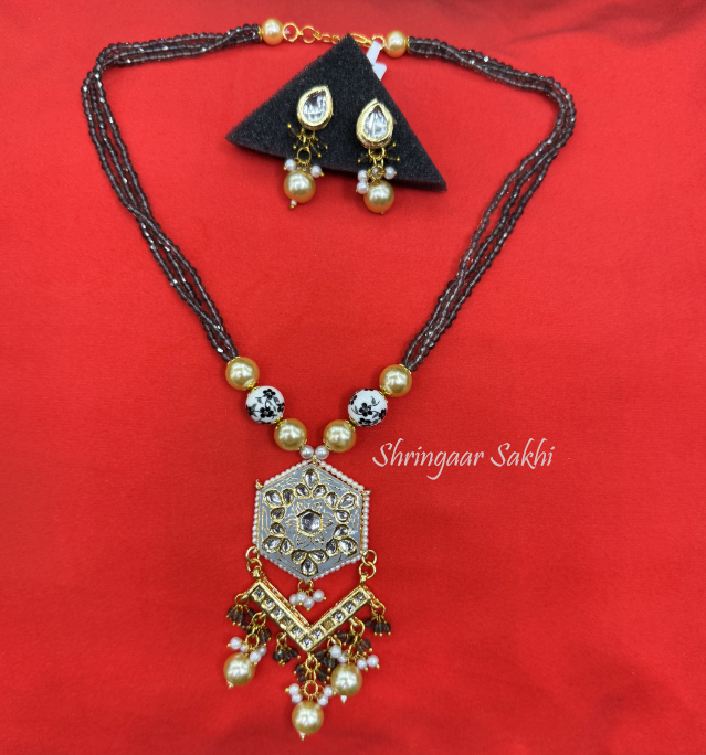 This striking necklace set features a unique combination of grey beads, pearl accents, and an intricately designed pendant in gold and silver tones. The hexagonal centerpiece, adorned with kundan stones, is complemented by elegant pearl drops and a geometric design. The matching earrings feature teardrop-shaped stones and delicate pearl detailing. This set offers a contemporary twist on traditional jewellery, making it perfect for festive occasions or evening events.