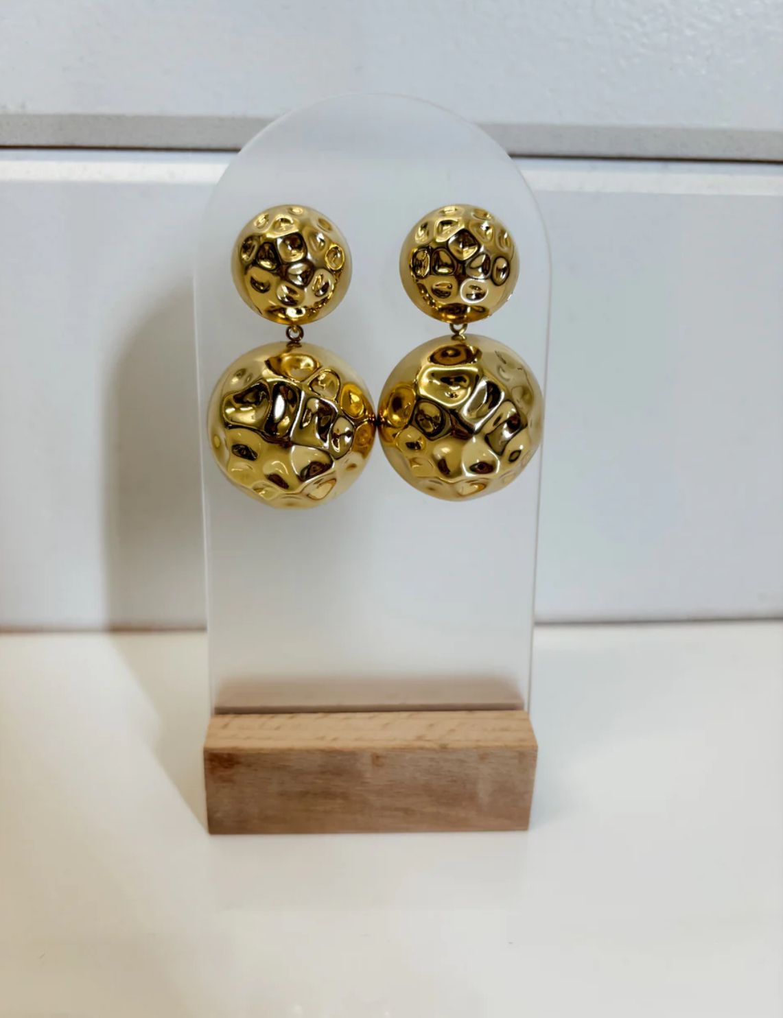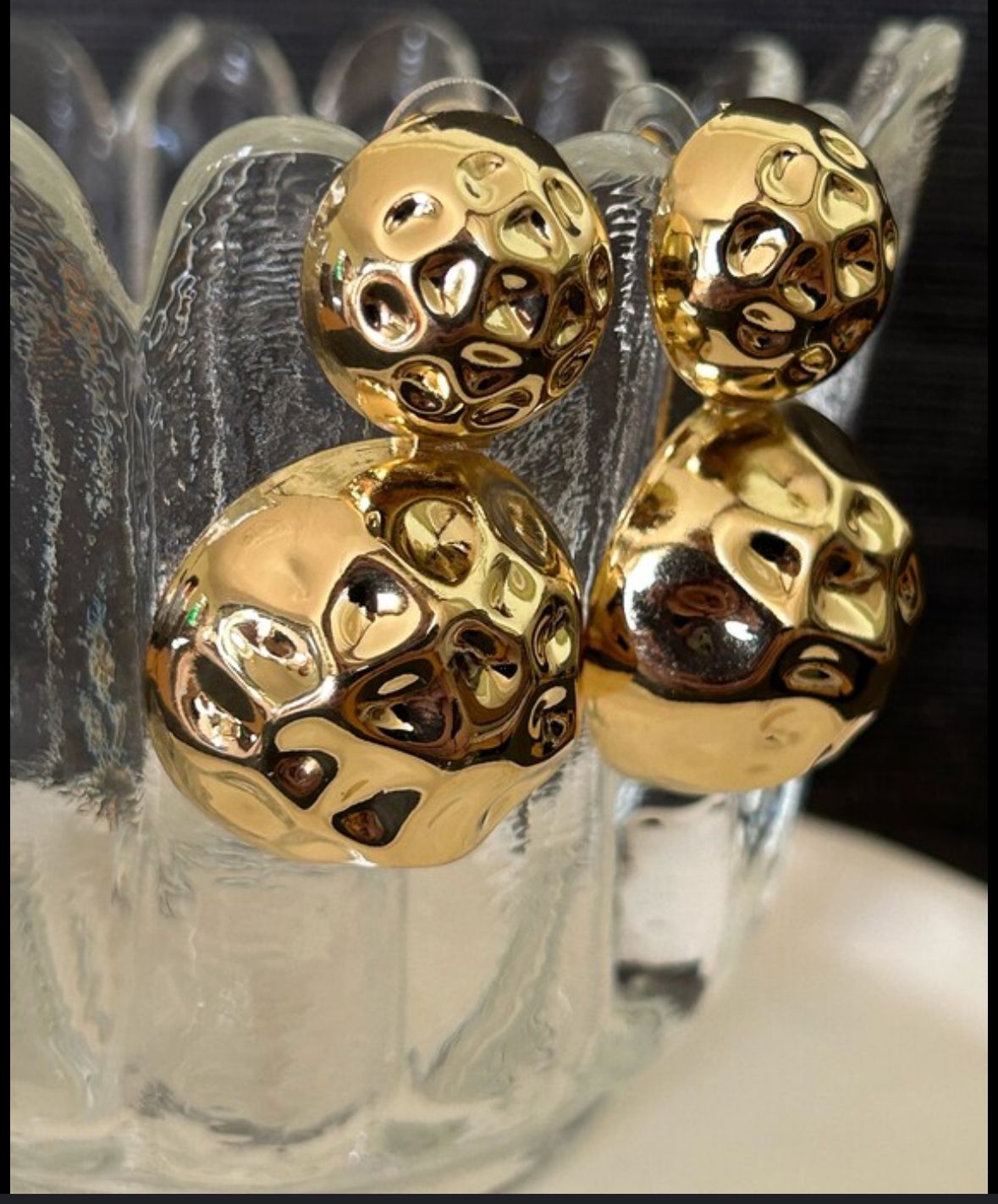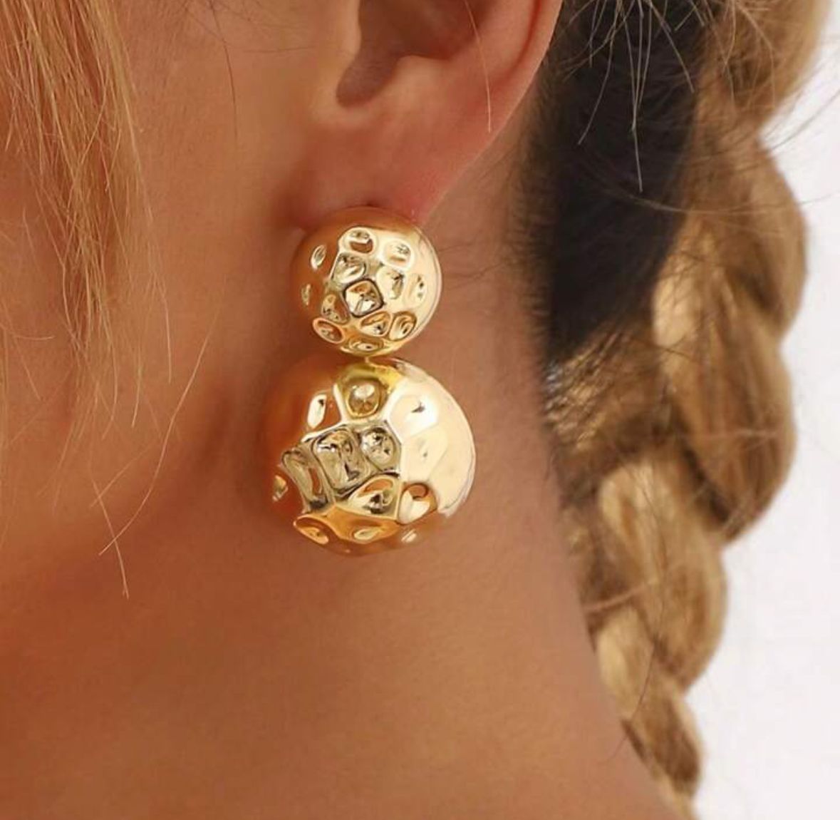 These bold, statement earrings feature a unique dual-sphere design with a molten gold finish that exudes high-fashion elegance. The irregular, crater-like texture on both orbs adds a modern, sculptural element, making them a standout piece for those who love edgy glam. The earrings offer a luxe, high-shine polish that instantly elevates any look with a touch of opulence.
