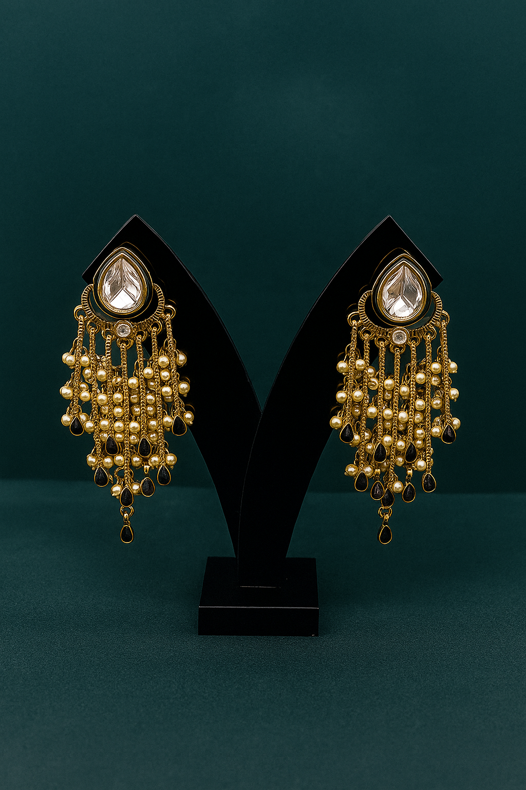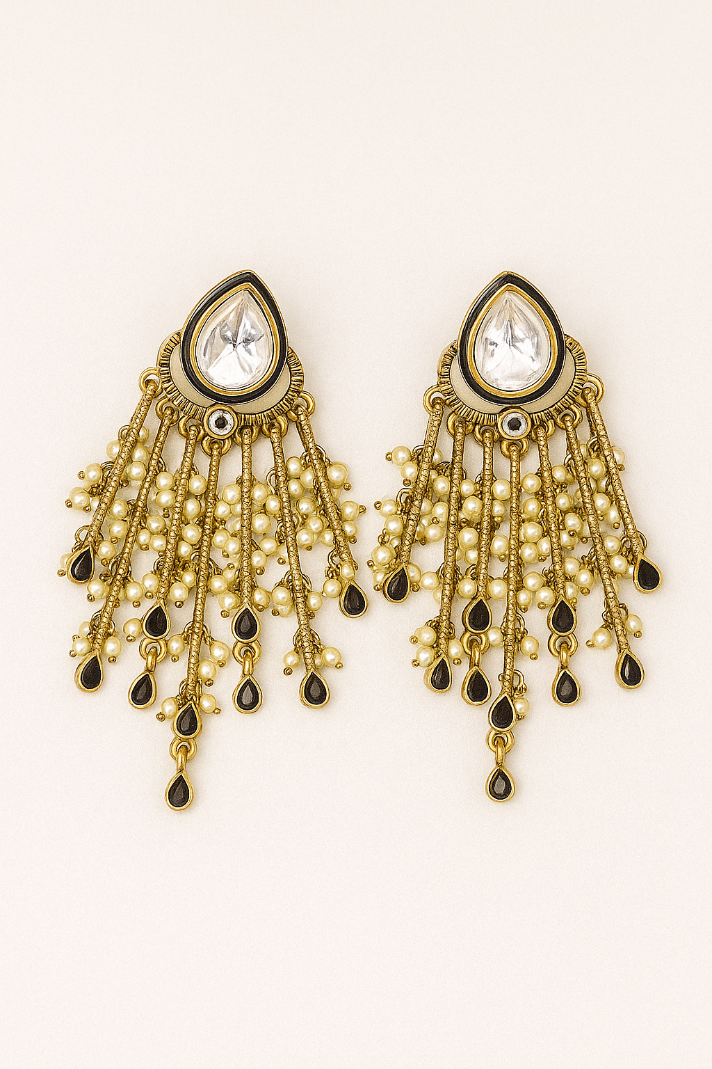 The Royal Noir Waterfall Kundan Danglers blend antique-gold artistry with modern sophistication. The bold pear-cut kundan centerpiece flows into multiple hand-detailed strands adorned with black enamel drops and soft pearls. Their fluid, cascading silhouette creates a graceful movement that elevates any festive or evening look. Perfect for weddings, cocktails, and elegant ethnic outfits.