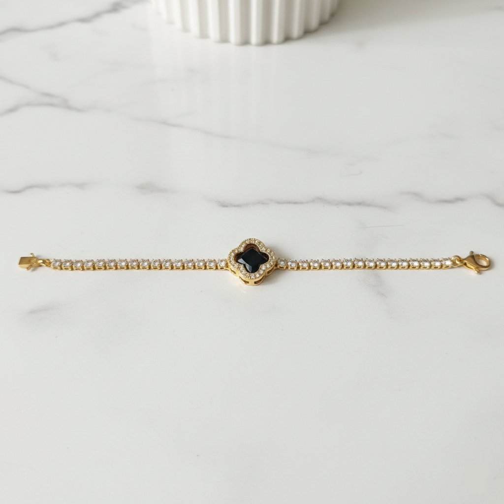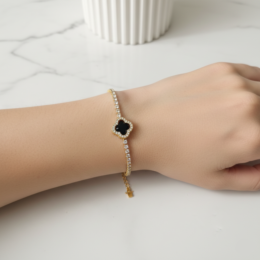 The Black Clover Royale Bracelet features a luxurious gold-finish tennis chain paired with a striking black clover centerpiece. Surrounded by high-shine CZ stones, the clover adds a bold yet elegant charm that instantly elevates any look. Crafted with premium alloy and polished to perfection, this bracelet is lightweight, durable, and designed for all-day comfort. A stylish fusion of sophistication and modern glamour.