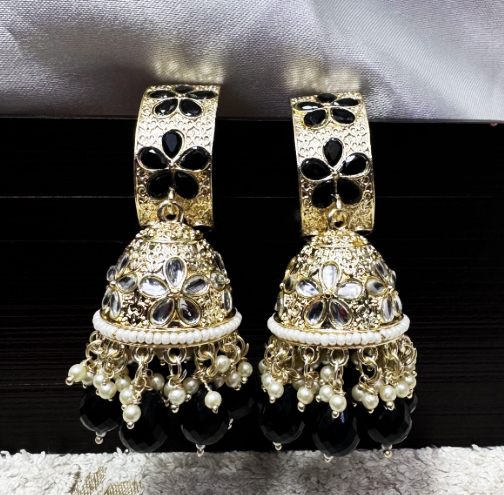 These exquisite jhumka earrings blend traditional charm with modern elegance. The upper portion features a wide hoop design adorned with intricate black enamel floral patterns, which adds a rich, artistic touch. Below, the jhumka part is embellished with floral motifs set with sparkling white stones and surrounded by layers of white pearls and bold black beads. The contrast between the black and white elements creates a striking balance, making these earrings an ideal accessory for both classic and contemporary outfits.