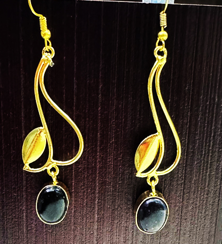 These elegant drop earrings showcase a fluid, gold-tone leaf motif paired with a glossy black oval stone, creating a perfect fusion of nature-inspired design and minimal sophistication. The delicate curves and organic form lend a graceful appeal, while the dark stone adds a subtle touch of drama and contrast. Lightweight and artistically styled, these earrings strike a beautiful balance between understated charm and refined detail.