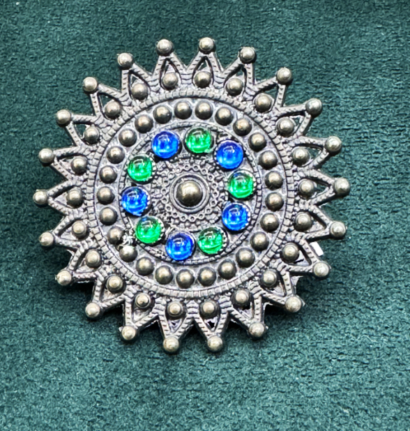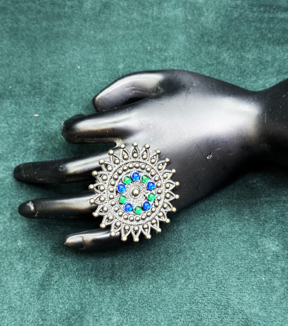 This statement finger ring boasts a beautifully intricate mandala-inspired design, crafted in antique silver-tone metal. The circular pattern is accentuated with a mix of blue and green stones, giving it a rich, ethnic charm. The detailed metalwork and beaded border create a striking visual impact, making it a perfect accessory for those who appreciate traditional craftsmanship with a vibrant twist. The adjustable band ensures a comfortable fit on any finger, enhancing its wearability for various occasions.