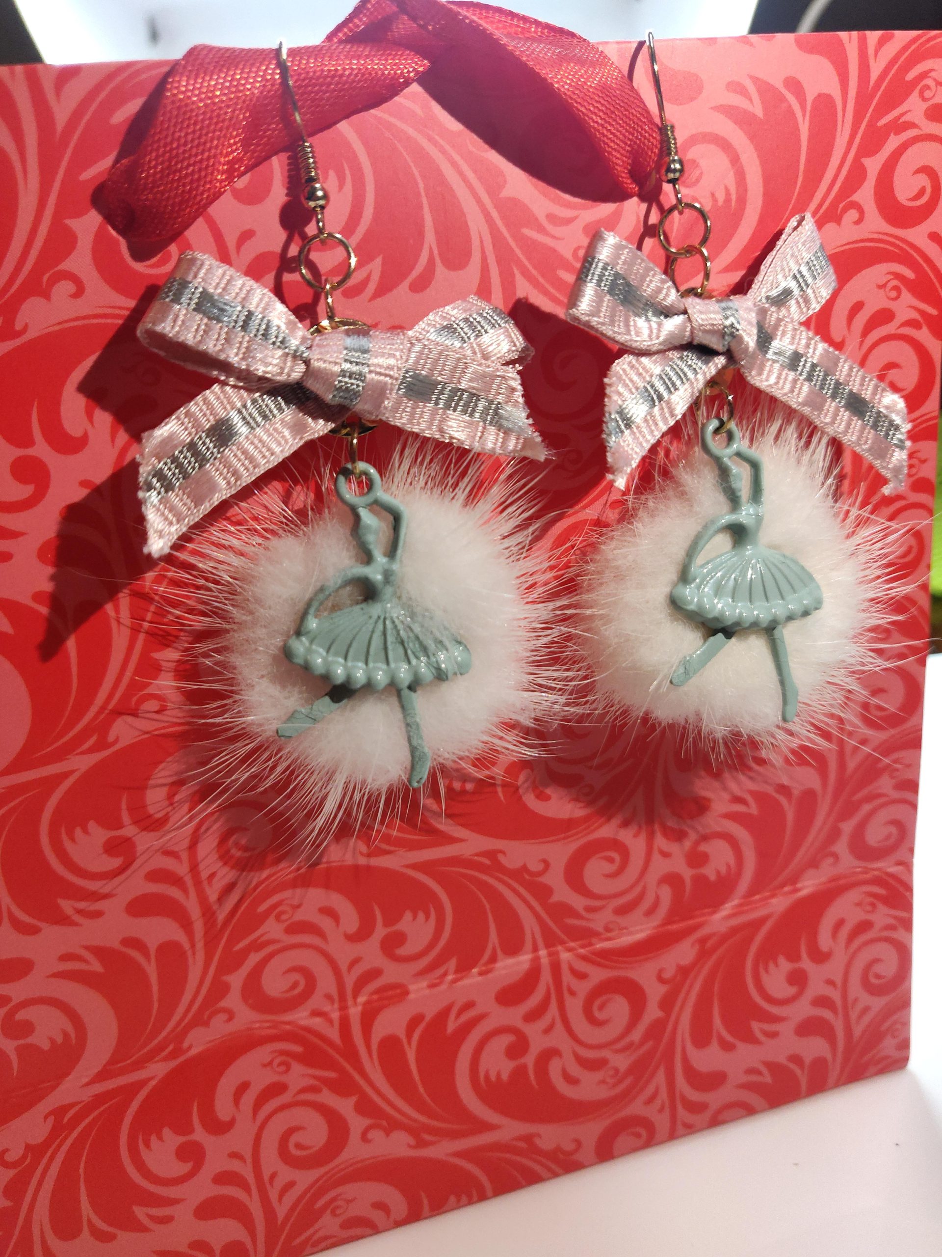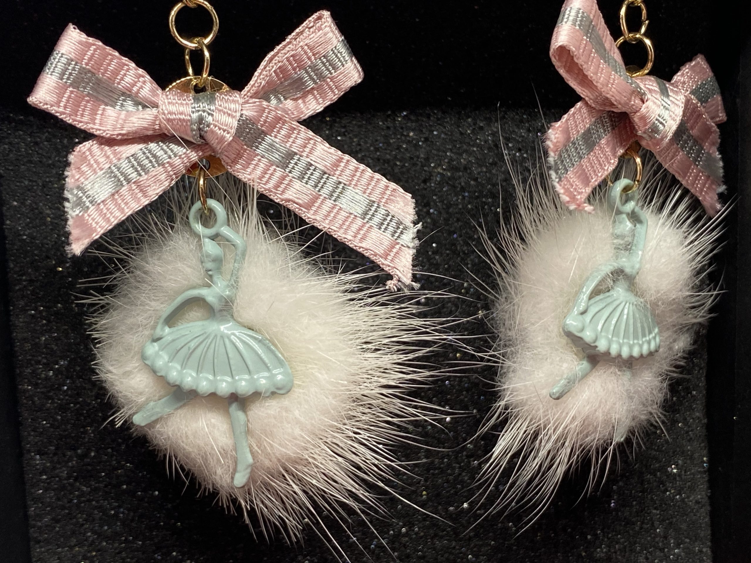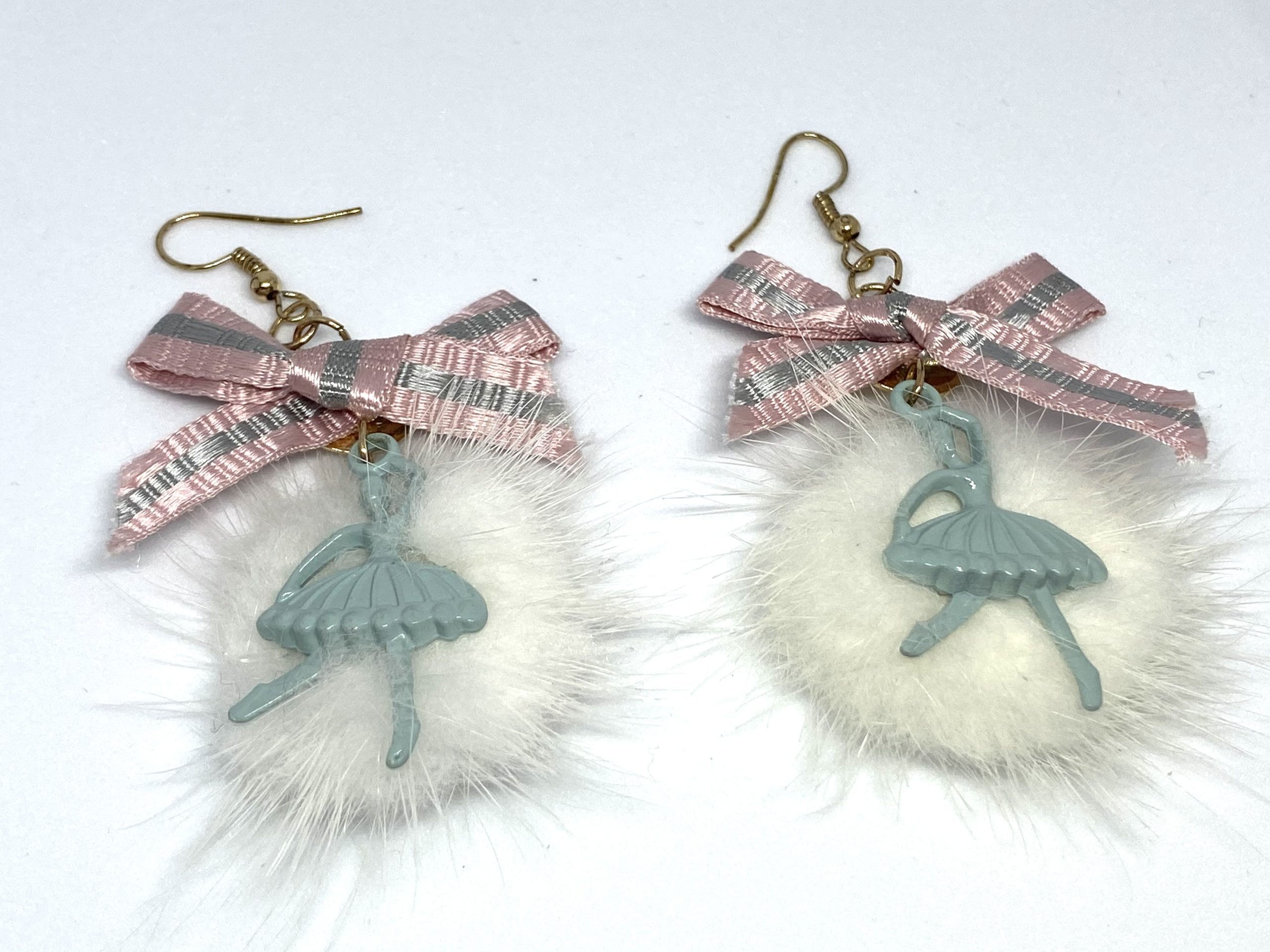 Adorable ballerina-themed earrings featuring a pastel blue dancer charm on a fluffy white fur base, topped with a pink and silver ribbon bow. Light, fun, and perfect for adding a playful touch.