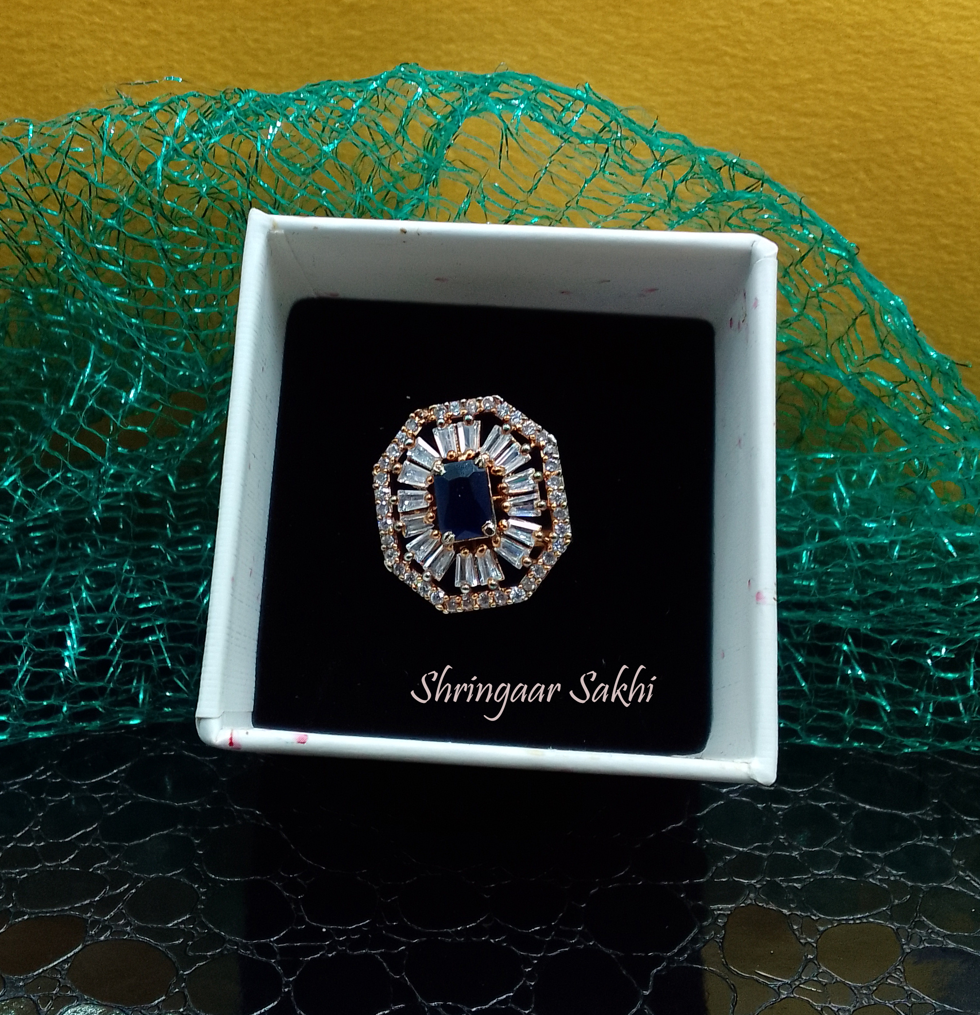 Style this ring with dark-toned evening wear like a velvet navy gown or an emerald green silk saree. To highlight the regal aesthetic, keep your hands bare except for this ring, and opt for soft waves or a low bun with bold eyeliner and a deep lipstick shade. A clutch with gold accents and matching stud earrings will complete the look without overpowering the ring’s brilliance.