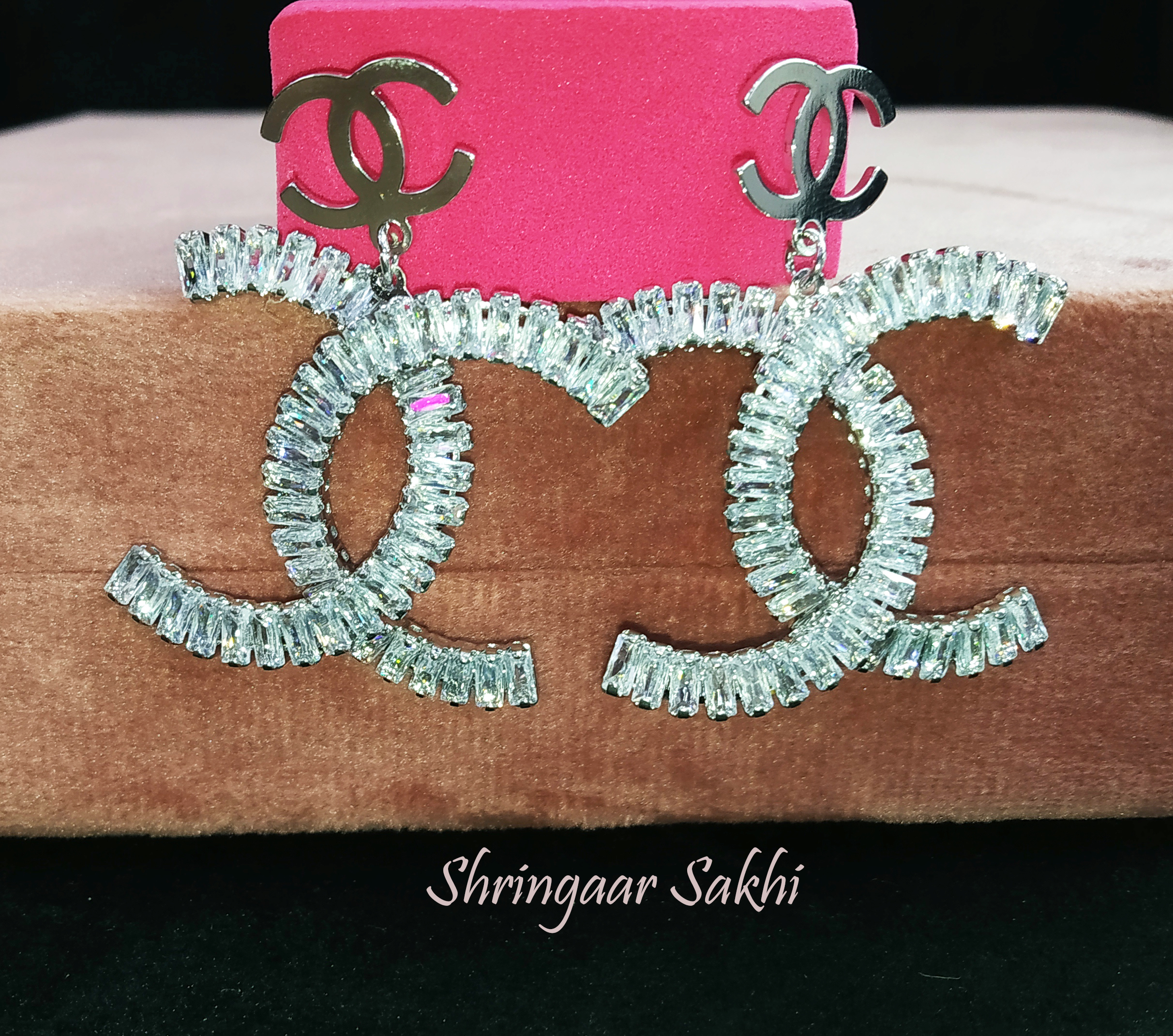 These glamorous earrings feature the iconic interlocked “C” design, encrusted with dazzling baguette-cut crystals that shimmer brilliantly with every movement. The polished silver-toned metal adds to the luxurious aesthetic, while the meticulous stone setting ensures a high-end, runway-ready finish. Bold, extravagant, and dripping with statement appeal, these earrings are perfect for those who want their accessories to turn heads.