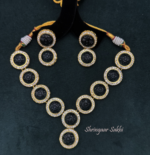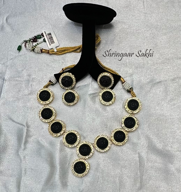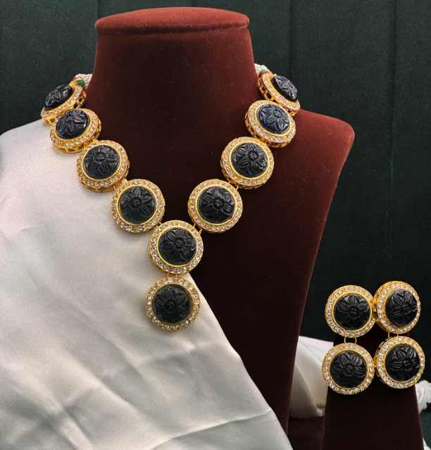 This bold necklace set features round black carved stones encased in elegant gold frames, surrounded by a sparkling layer of kundan stones. The matching earrings carry the same design, creating a cohesive and striking look. The combination of deep black and gold offers a perfect balance of traditional craftsmanship with a modern edge, making this set ideal for festive occasions, evening events, or cultural celebrations.