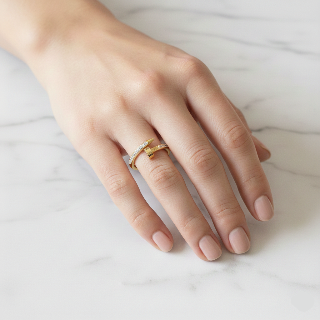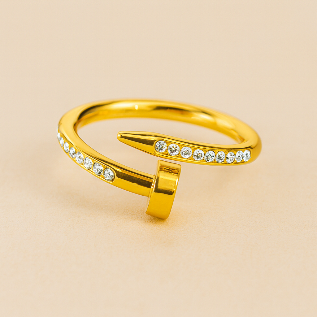 The Crystal Nail Wrap Ring features a chic, modern design inspired by the iconic nail silhouette. Encrusted with sparkling cubic zirconia, it blends bold structure with feminine shine, making it a true statement accessory. Crafted from high-quality alloy and finished with a luxurious gold polish, the ring exudes elegance from every angle. Lightweight, comfortable, and adjustable, it’s a must-have for trend-forward jewelry lovers.
