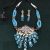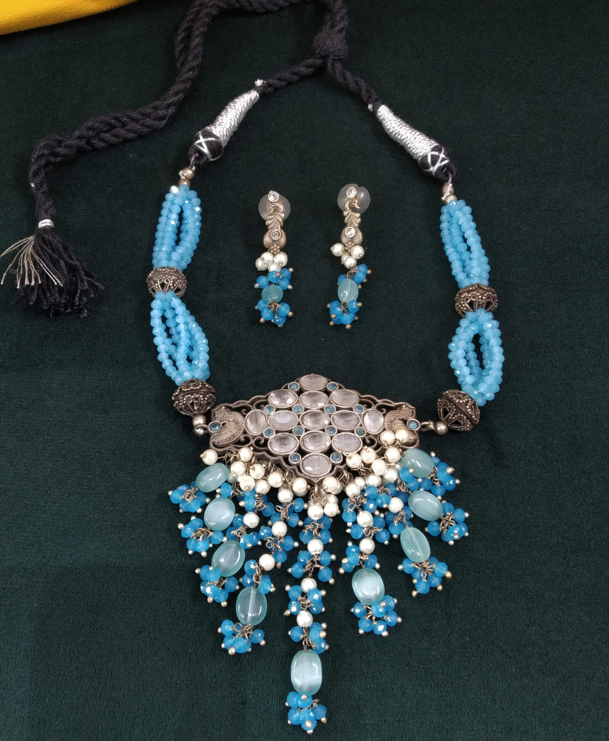 This vibrant oxidized silver necklace set, with its cascading blue beads and intricate detailing, is perfect for making a bold statement. Pair it with solid-colored outfits like a plain white, ivory, or black saree or kurta to let the jewelry shine. For a more festive look, wear it with a contrasting silk blouse or lehenga in shades like mustard, deep maroon, or bottle green. Keep the neckline simple to showcase the elaborate pendant design, and opt for minimal makeup with a focus on the eyes or lips to balance the overall look. Tie your hair in a sleek bun or side braid to enhance the elegance and draw attention to the earrings.