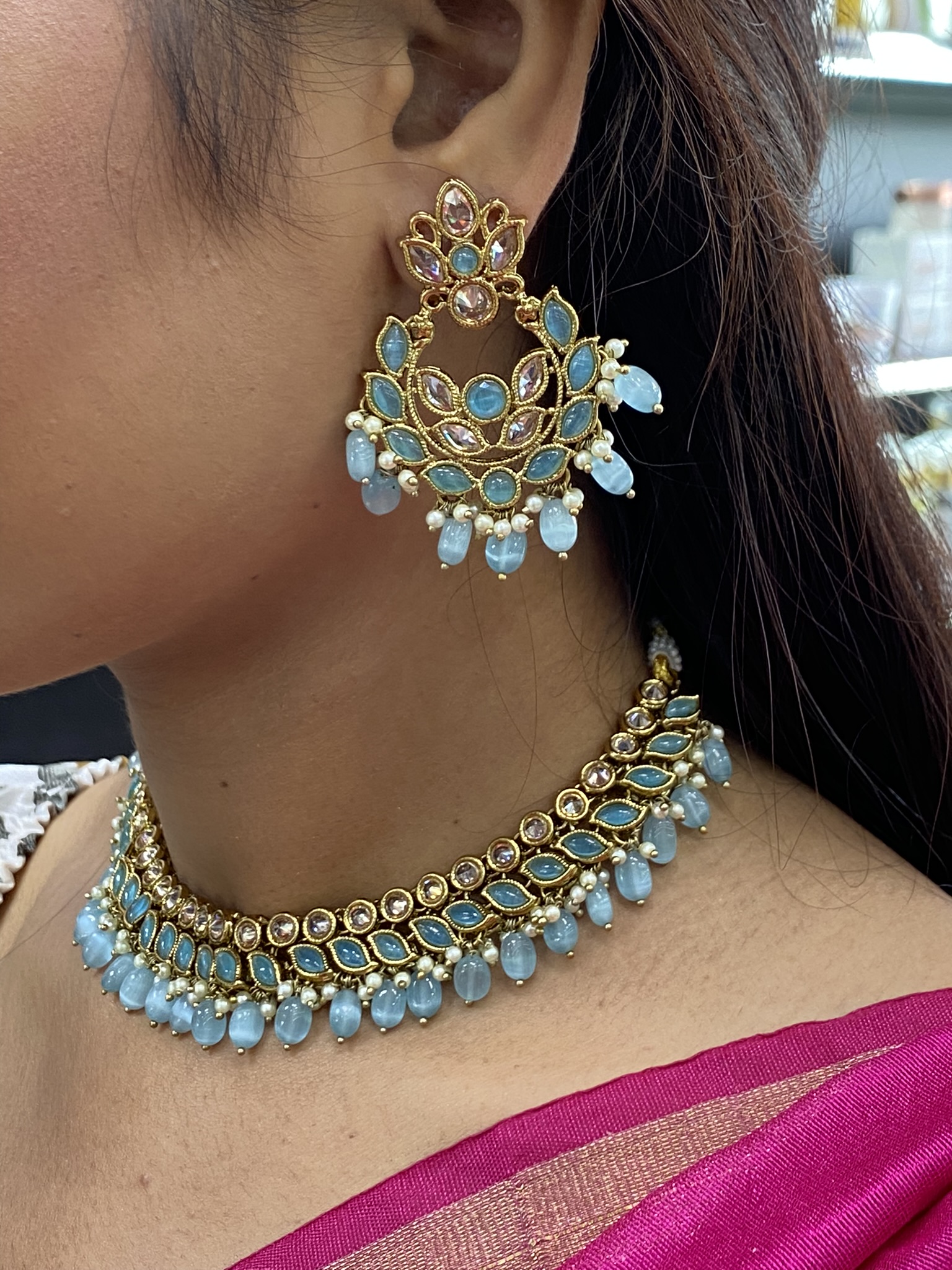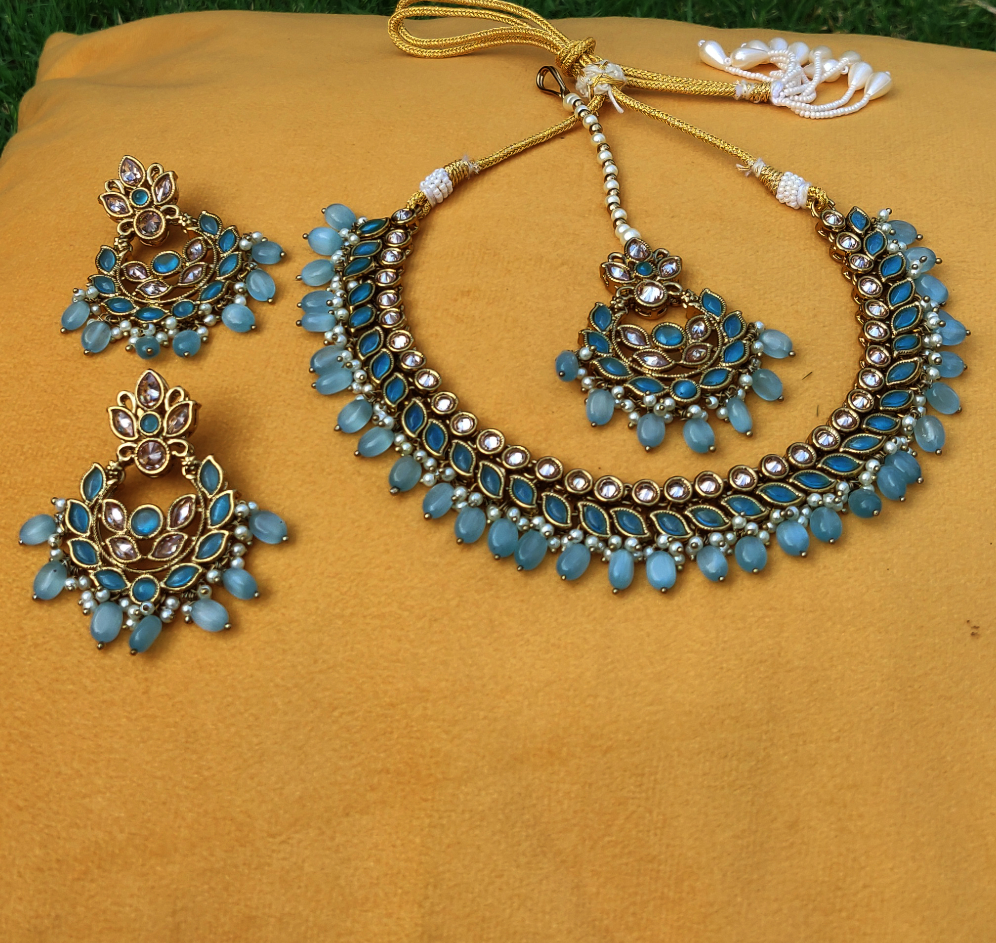 This is a Kundan golden combo set: a harmonious blend of tradition and contemporary allure. With a captivating choker, intricate earrings, and delicate mangtikka, adorned with enchanting cyan blue stone work, this ensemble exudes elegance.