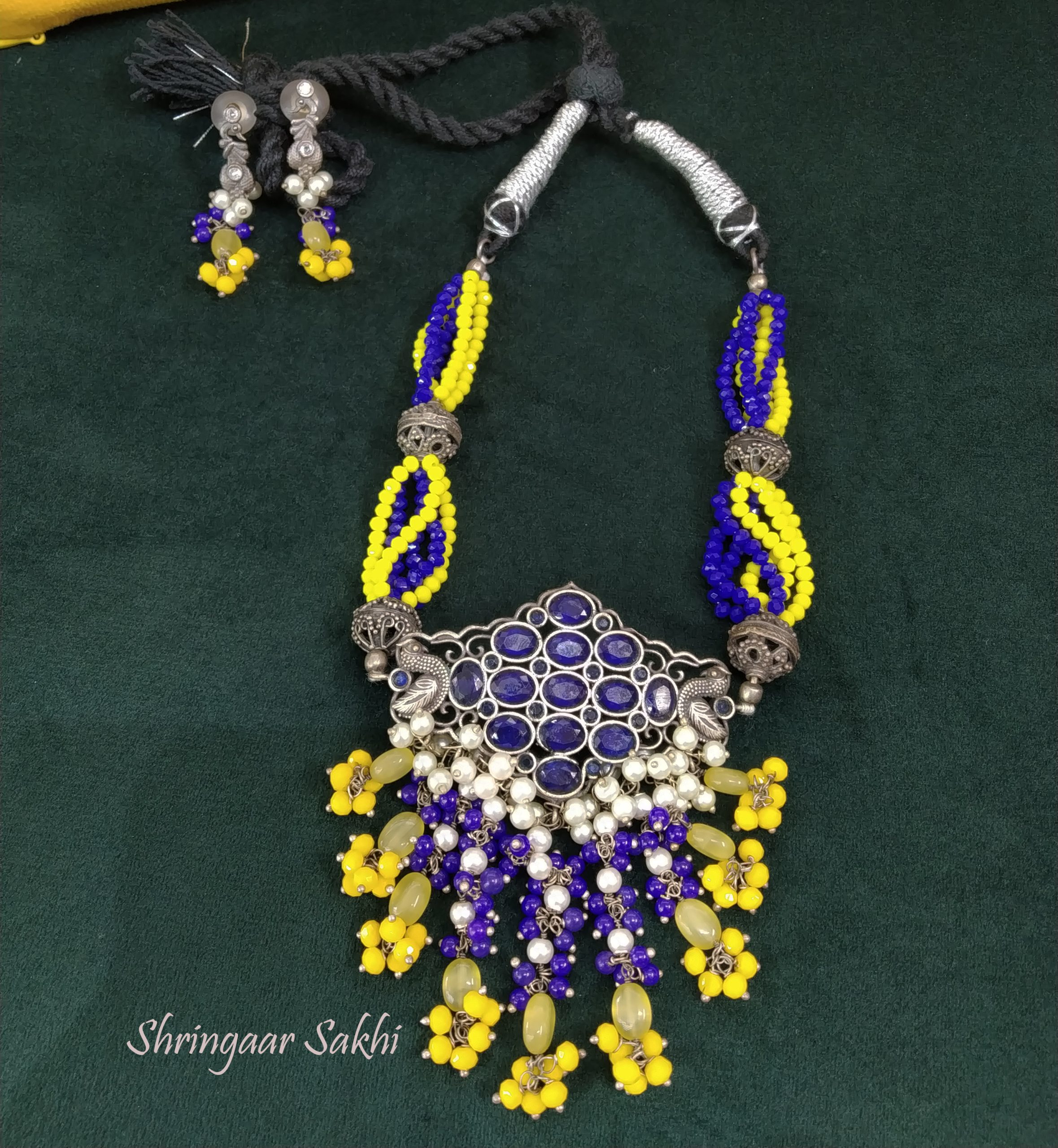 This vibrant statement necklace from Shringaar Sakhi is a stunning fusion of tradition and playfulness. Crafted in oxidized silver, the piece features a bold centerpiece adorned with deep blue stones and delicate pearl-like detailing. The layered beaded strands in bright yellow and rich blue add a burst of color and contrast, while the intricate dangling elements with yellow -toned beads enhance the overall ethnic charm. Paired with matching earrings, this set is perfect for festive occasions, cultural events, or when you want to make a unique style statement with handcrafted elegance.