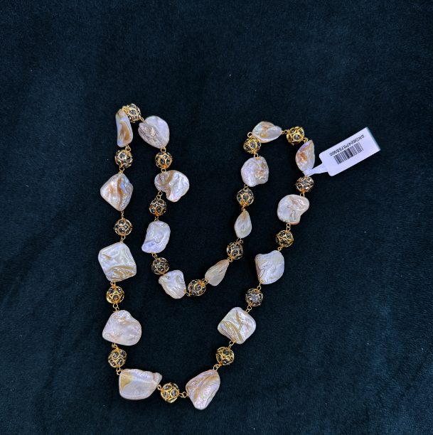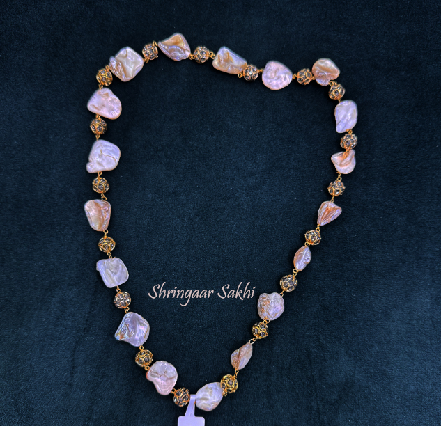 This unique necklace features irregularly shaped pearls linked by intricate gold beads, giving it a rustic yet elegant look. The natural, organic form of the pearls adds a distinctive charm to the piece, making it perfect for adding a touch of sophistication to both casual and formal outfits. Its understated design makes it versatile, ideal for pairing with traditional Indian wear or even Western outfits.