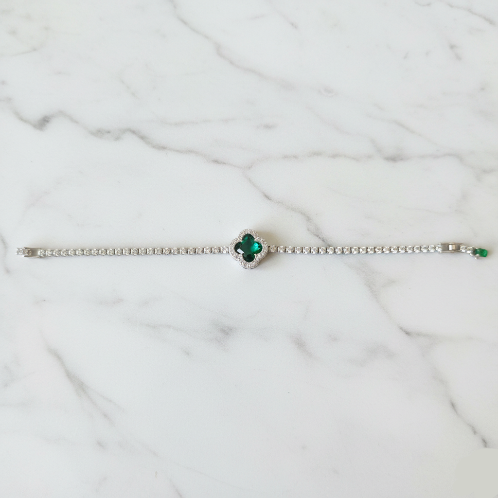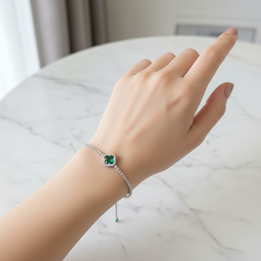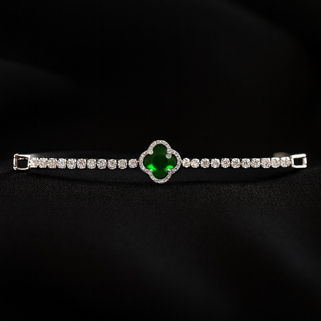 The Emerald Clover Charm Bracelet features a sparkling tennis-style chain paired with a gorgeous clover-shaped centerpiece studded with a rich emerald green stone. Surrounded by shimmering CZ crystals, the clover adds a touch of luxury and sophistication to this elegant bracelet. Crafted in a premium silver-finish alloy, it sits comfortably on the wrist while offering a high-shine, premium look. A perfect blend of minimalism and charm for everyday grace and special occasions.