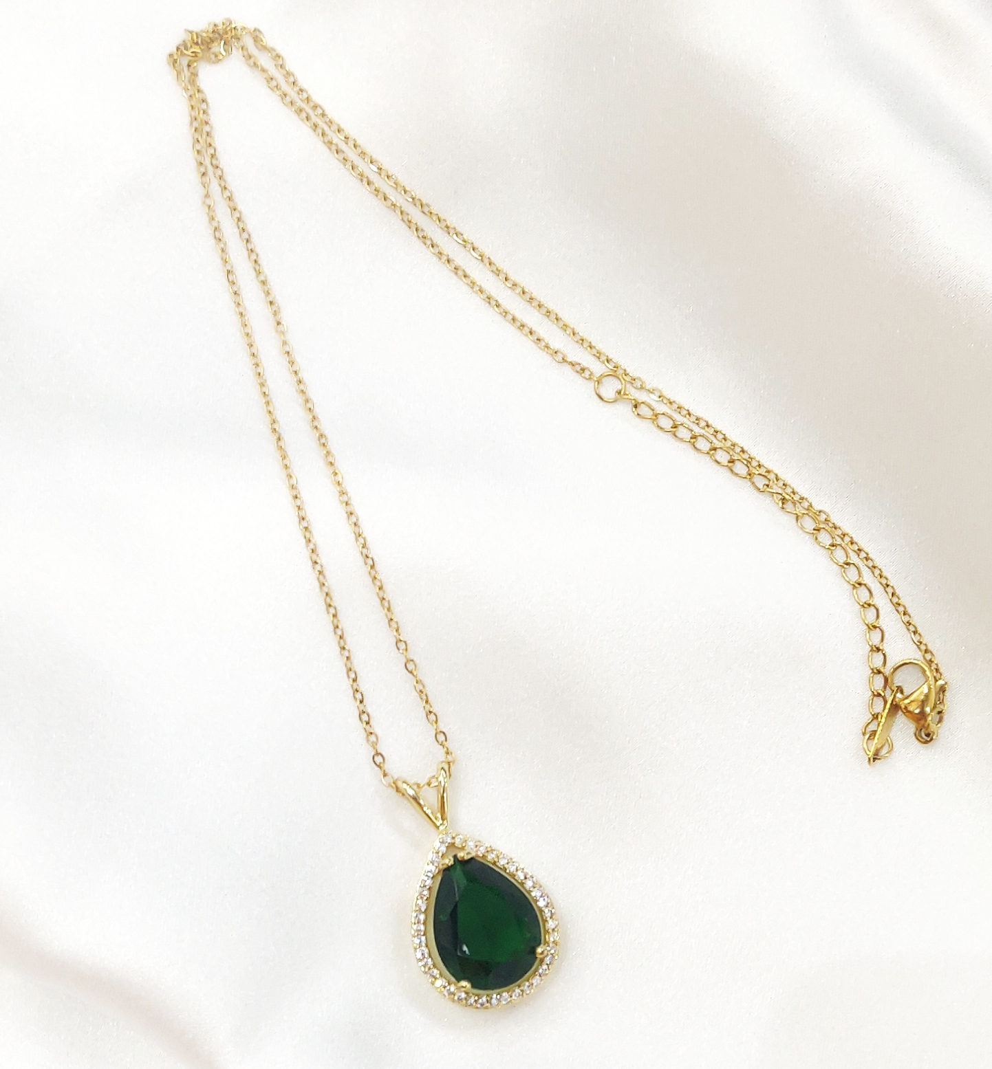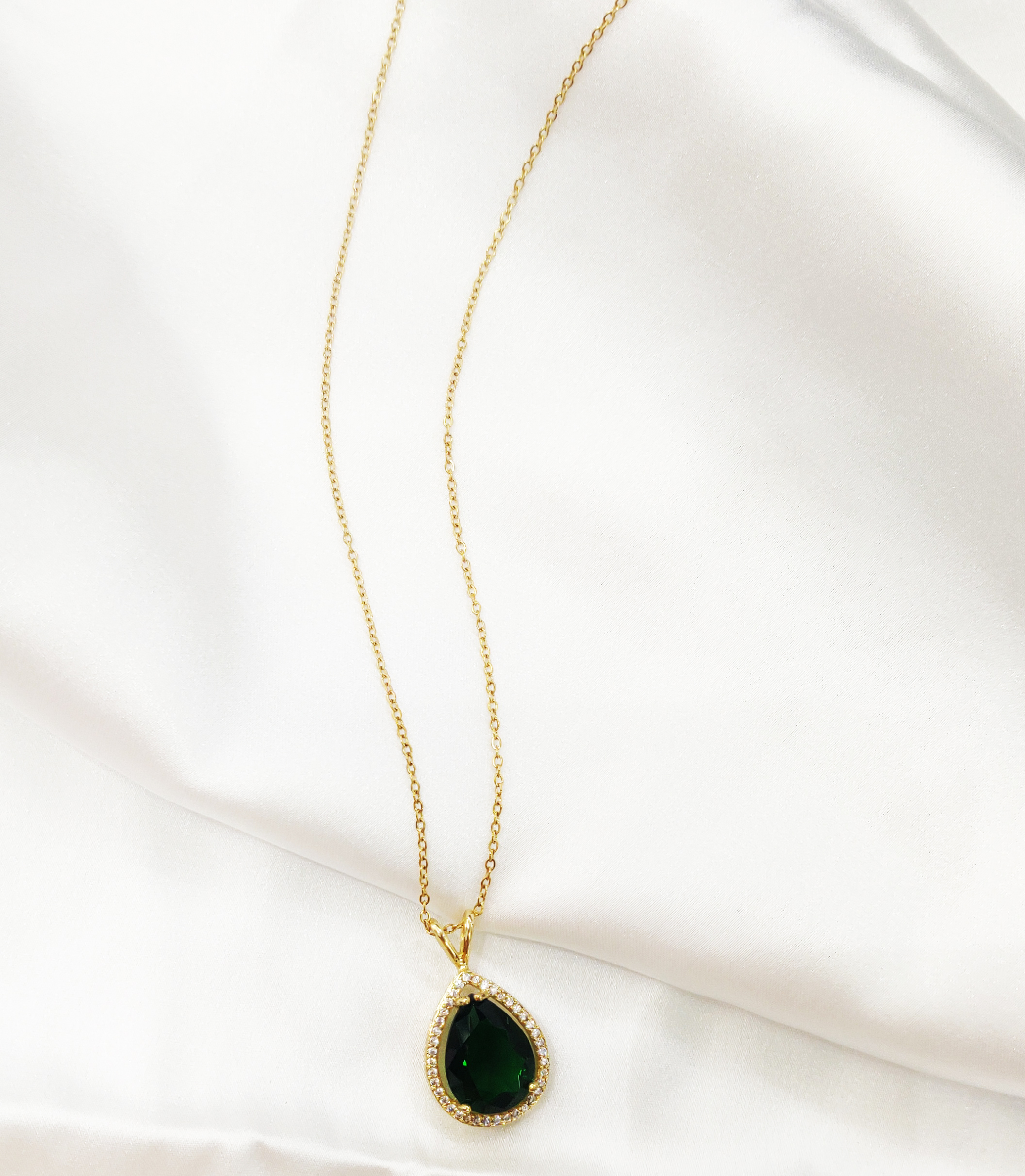 This exquisite necklace showcases a teardrop-shaped deep emerald green stone, beautifully framed by a halo of shimmering white crystals. Set in a delicate gold-toned chain, the pendant embodies timeless sophistication and elegance. The contrast between the rich green center and the sparkling frame adds depth and brilliance, making it a standout accessory for both formal and semi-formal occasions.