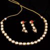 An ideal festive season accessory, this necklace is sure to turn heads. It features a beautiful circular pattern. The set also has a bright element of Kundan detailing in its structure. Be sure not to miss out on this stunning necklace set this eventful season as there are ramps ahead.