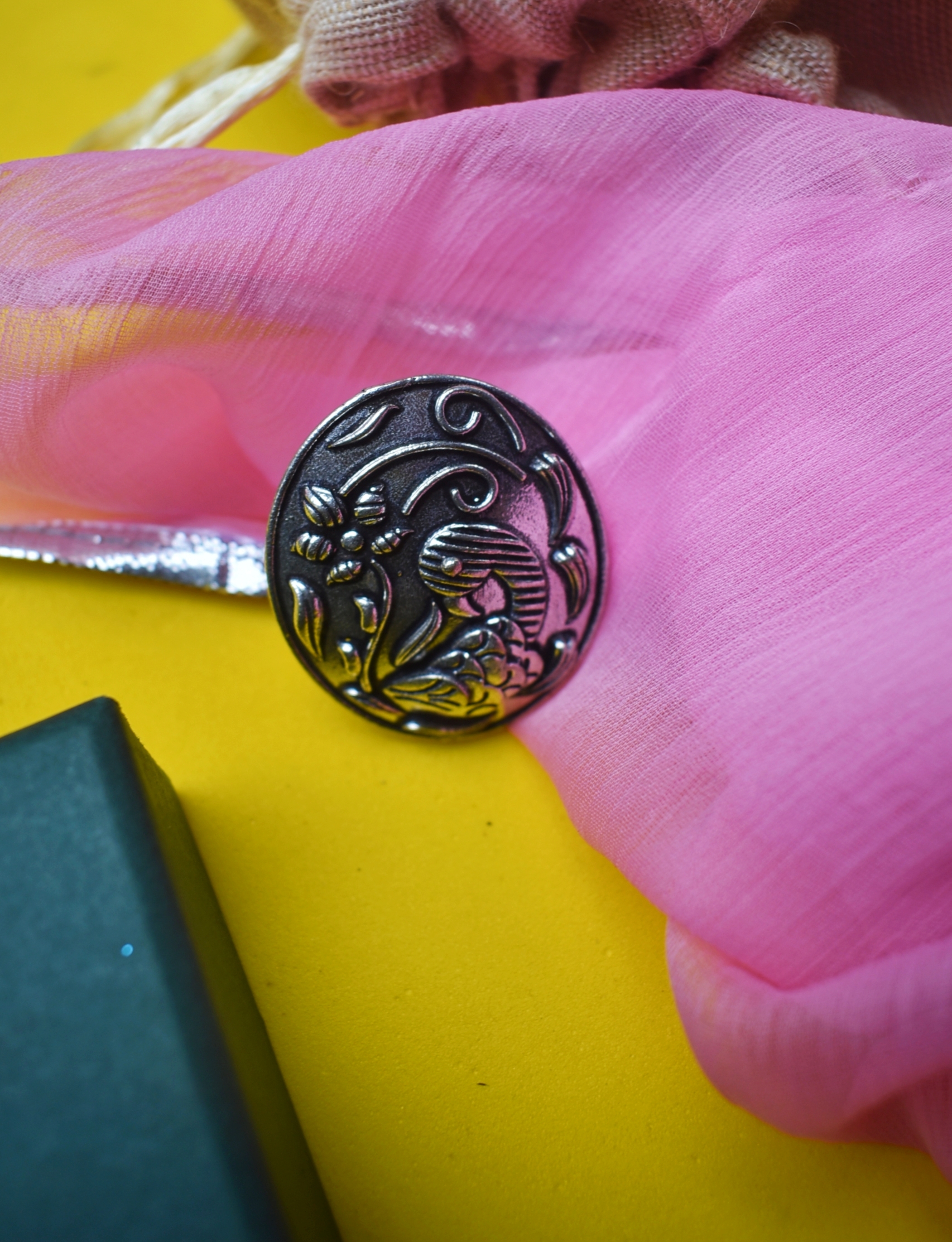 This elegant oxidized silver ring showcases a beautifully engraved floral motif, accentuated by graceful curves and organic patterns. The design evokes a blend of vintage charm and nature-inspired artistry, perfect for those who appreciate subtle sophistication. The smooth oval shape and high-relief detailing add a refined touch, making it a timeless accessory that stands out without being overpowering.