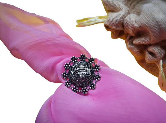 This stunning oxidized silver ring features an intricate depiction of a traditional feminine face, surrounded by delicate floral patterns, giving it a vintage, ethnic charm. The craftsmanship highlights fine detailing that adds depth and texture, making it a statement piece. Set against a soft pink fabric, the ring exudes a regal yet earthy feel, perfect for those who appreciate artisanal jewelry with cultural symbolism.