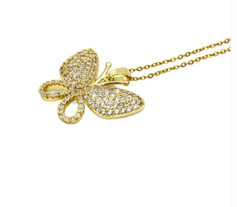 This enchanting butterfly necklace is a radiant blend of charm and elegance. Crafted in a rich gold-tone finish, the butterfly pendant is adorned with numerous sparkling white stones, adding a luxurious shimmer to its delicate design. The graceful curves and open wing detail on one side enhance the pendant’s whimsical appeal, making it a standout piece that symbolizes transformation and beauty.