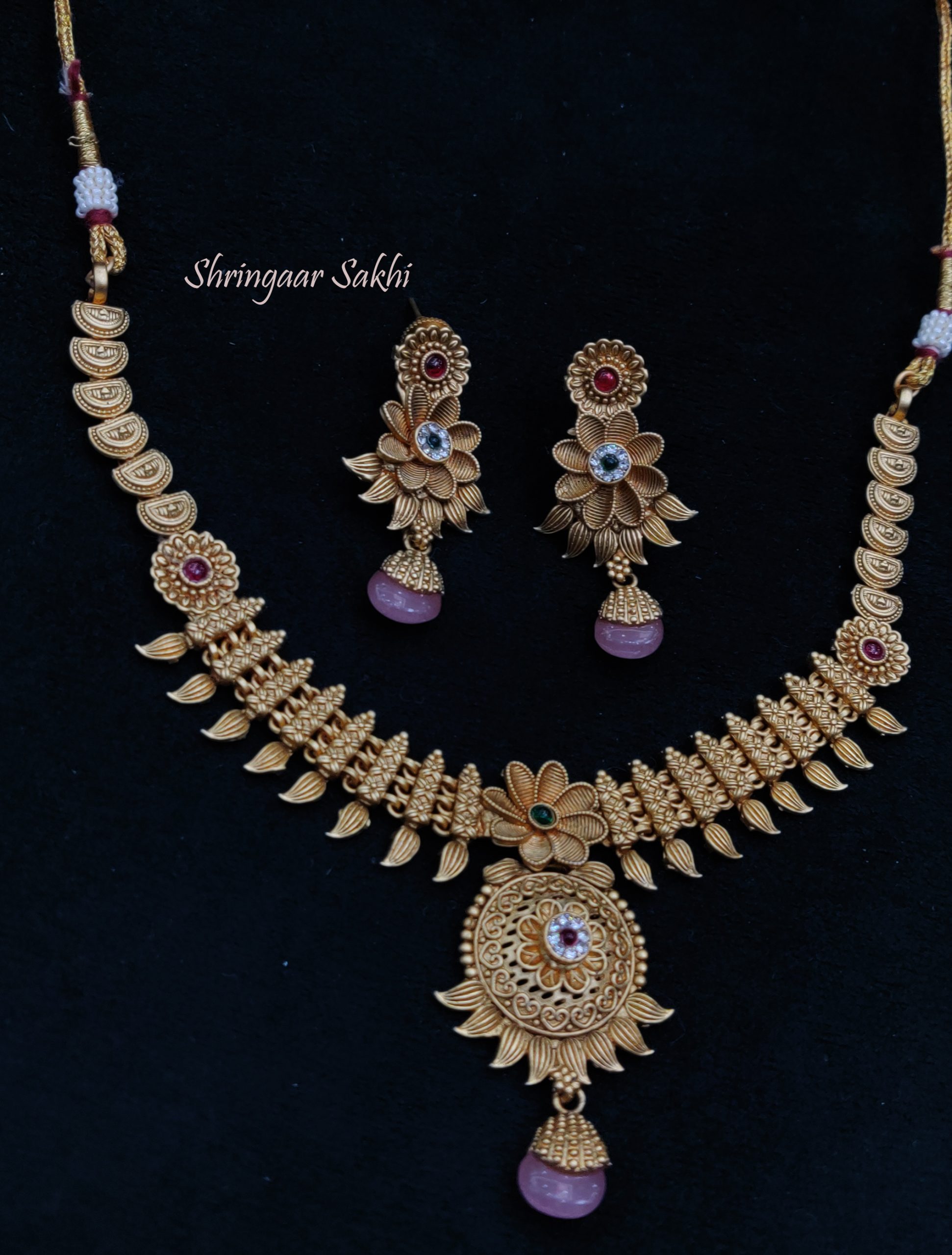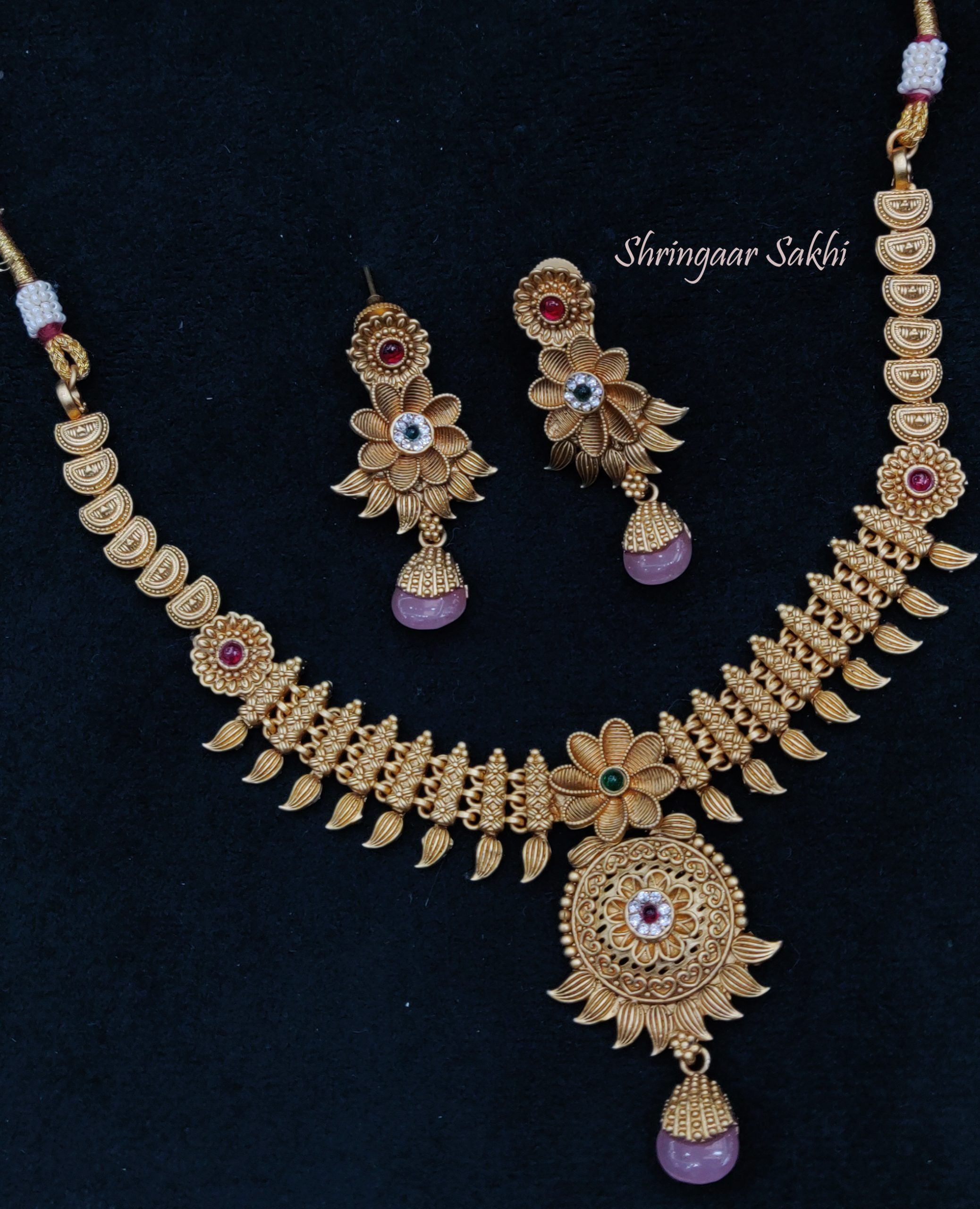 A beautifully crafted design with a matte finish exudes elegance and sophistication. The matte texture adds a subtle yet luxurious touch to the piece, providing a refined and modern aesthetic. Each detail of the design is meticulously crafted, showcasing expert craftsmanship and attention to detail. This necklace is the ultimate accessory option for the festive season. This set has the most gorgeous circular floral pattern. The matte texture enhances the richness of the metal, creating a soft yet striking aesthetic that complements any outfit.
