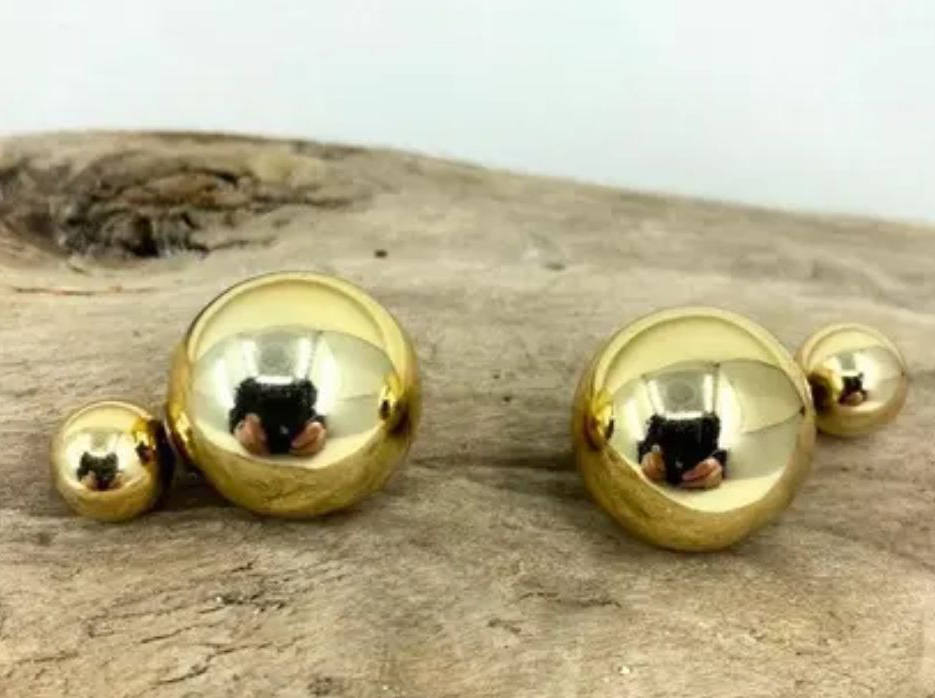 Bold and contemporary, these gold-tone double ball earrings make a striking statement with their minimalistic design. Featuring a polished mirror-like finish. Their smooth, rounded silhouette adds an elegant, modern edge, making them perfect for fashion-forward wearers.