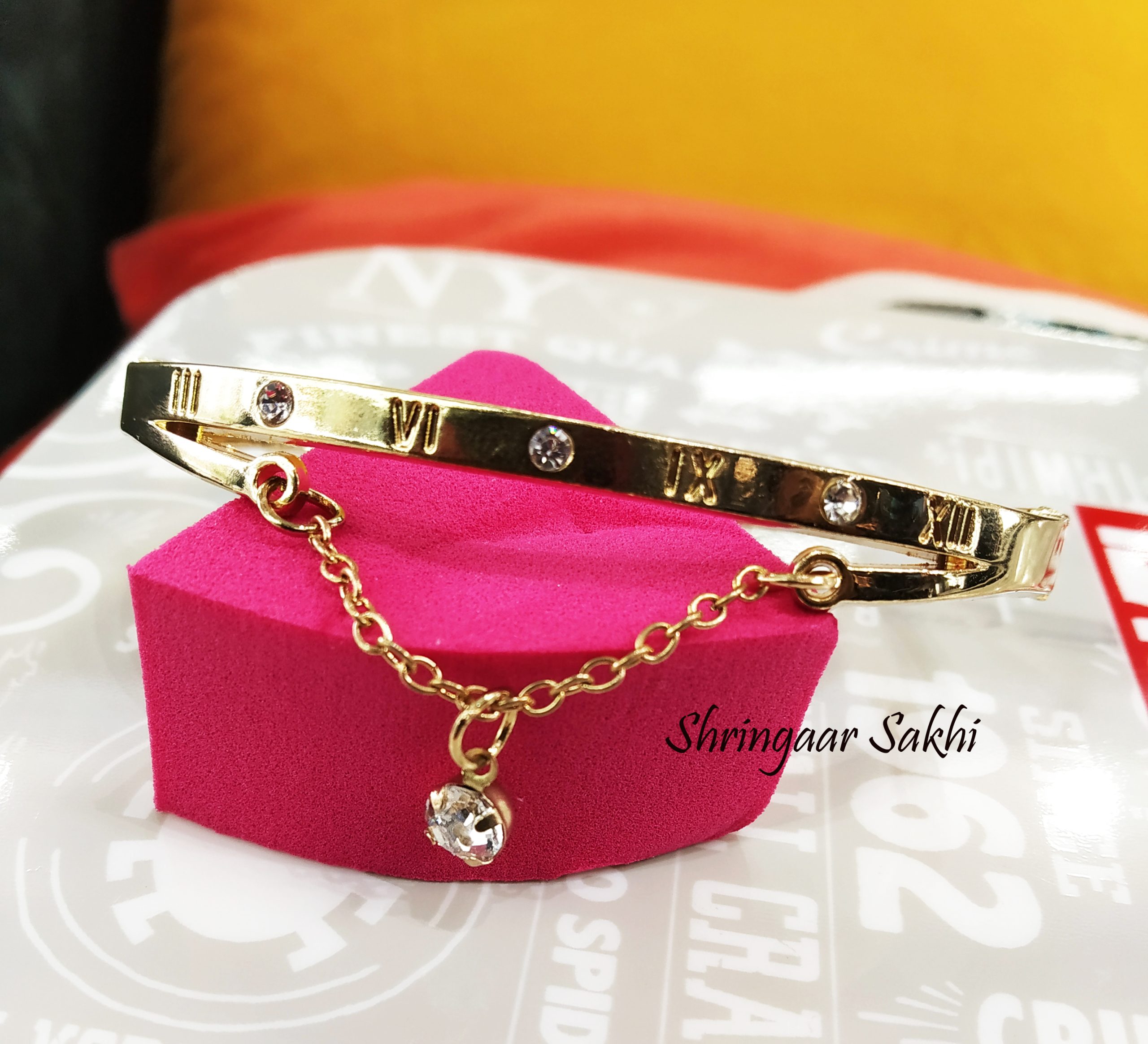 Timeless elegance meets contemporary charm in this golden bracelet engraved with Roman numerals and accented by shimmering stones. The design features a sleek metallic band paired with a delicate dangling chain and crystal charm, blending classic motifs with modern flair. It’s a sophisticated piece that symbolizes time, making it a thoughtful gift or a personal statement accessory.