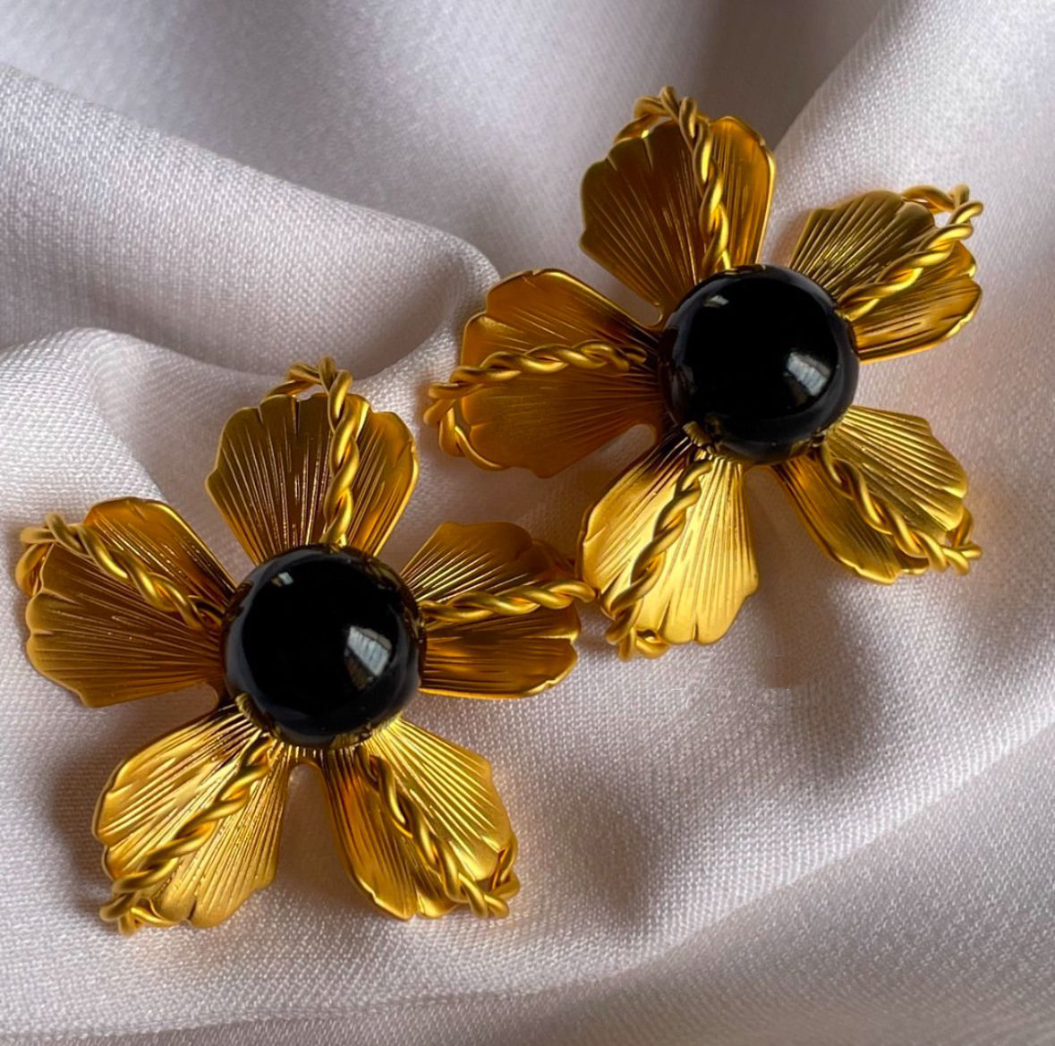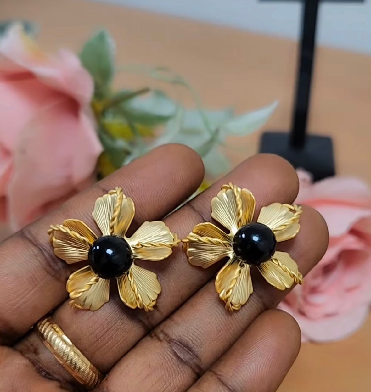 These exquisite floral earrings blend vintage charm with a modern twist. Crafted in a rich gold tone, the petals showcase fine ridged detailing and twisted edges that give them a sculptural, almost baroque finish. At the heart of the flower is a bold, glossy black bead, adding a striking contrast and anchoring the design with a touch of drama. Radiating elegance and femininity, these earrings make a perfect statement piece for any jewelry lover seeking a timeless yet artistic look.
