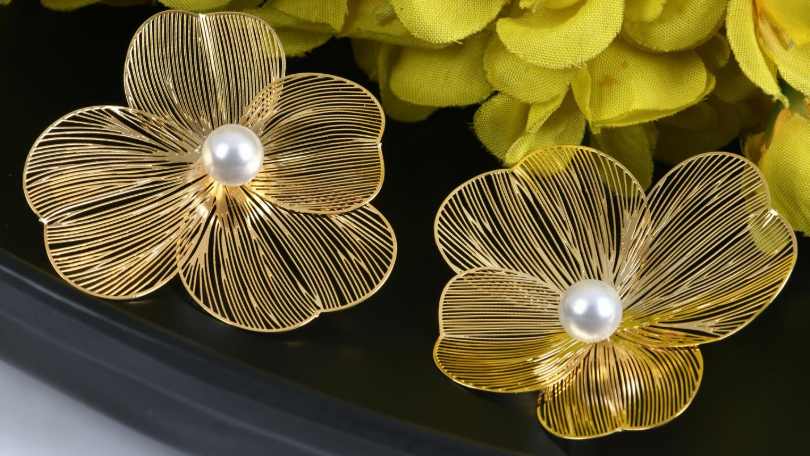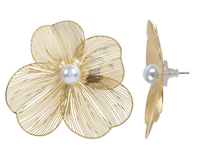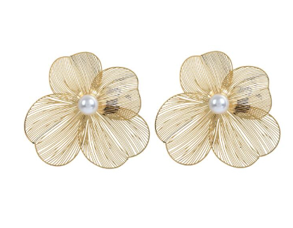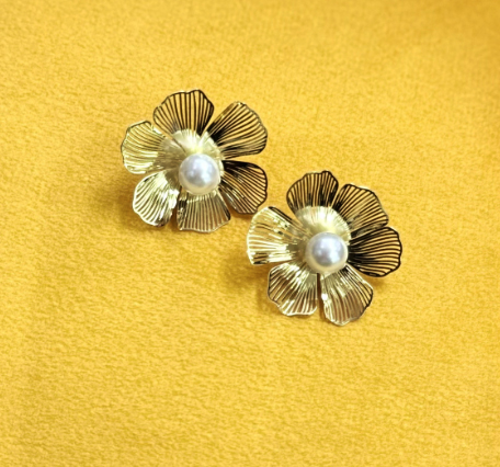 These charming floral earrings are designed in the shape of delicate five-petal flowers, with a lustrous white pearl nestled at the center. Crafted with a mix of textured and outlined petals, the gold-toned finish adds an elegant contrast that enhances their three-dimensional appearance. The overall design radiates femininity and freshness, making them a delightful addition to any accessory collection.