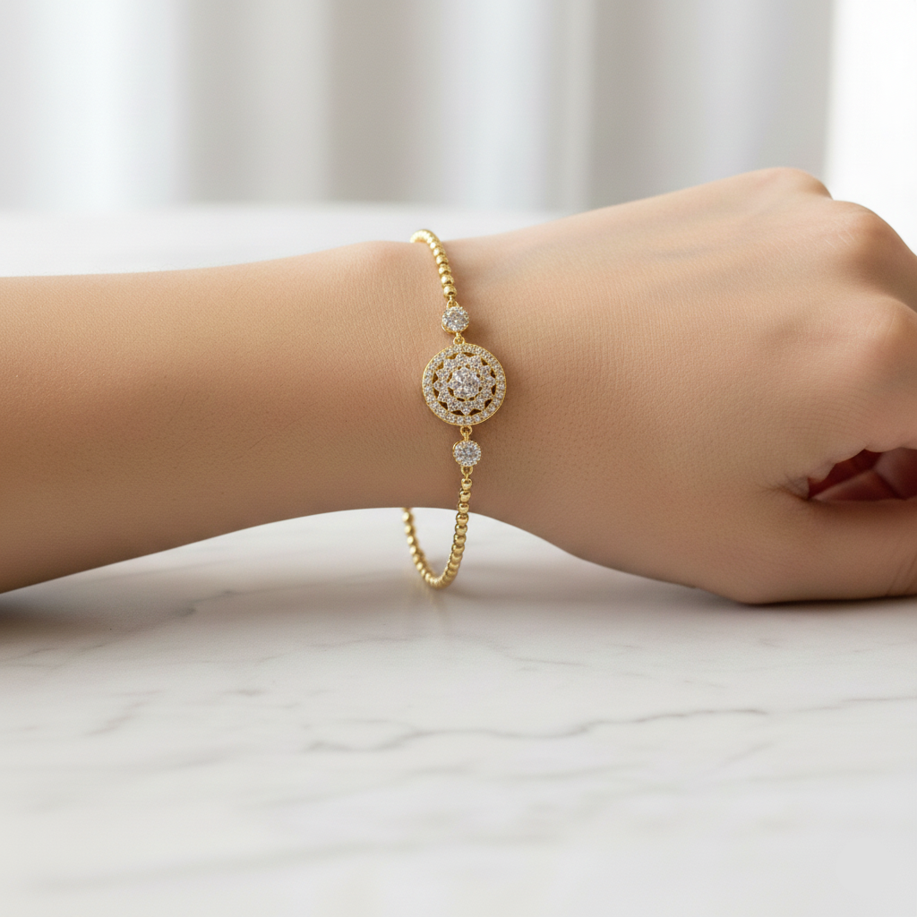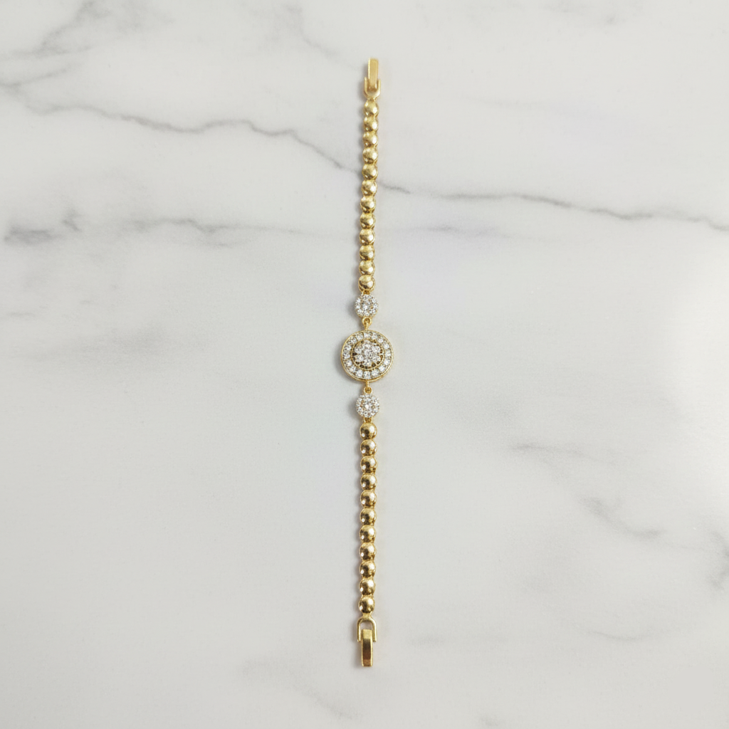 The Golden Halo Radiance Bracelet features a luxurious beaded chain design with a sparkling halo centerpiece, crafted to add instant elegance to any look. Each bead is polished to a mirror-like shine, while the central disc is encrusted with shimmering CZ crystals that radiate brilliance from every angle. Lightweight yet premium, this bracelet sits comfortably on the wrist and is secured with a sturdy clasp. A perfect blend of tradition and modern sophistication.