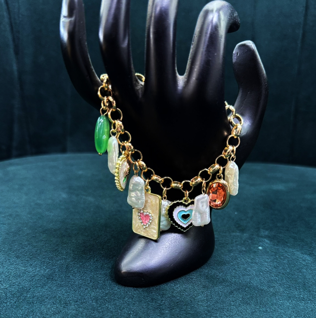This eclectic charm bracelet is a delightful mix of elegance and whimsy, featuring a series of eye-catching elements like faux pearls, enamel hearts, rose motifs, and gem-like accents. The chunky gold chain base provides a rich contrast to the soft luster of the pearls and the colorful charms, creating a dynamic and stylish look. Each charm adds a unique story, making this bracelet not just an accessory, but a piece of wearable art.
