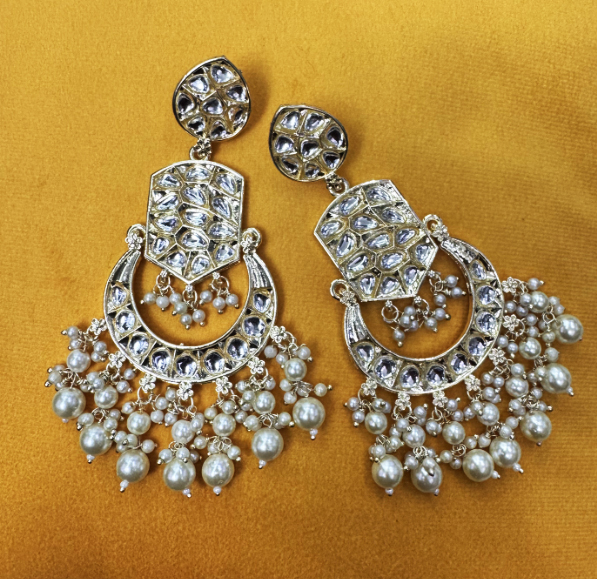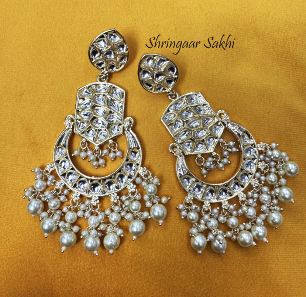 These stunning earrings feature an opulent fusion of traditional Kundan work and delicate pearl embellishments. The intricate design includes a chandelier-style silhouette with a central crescent motif, studded with uncut mirror-like stones and crowned with a geometric panel. The fringe of clustered pearls adds graceful movement and richness, making this piece a quintessential pick for festive or bridal occasions.