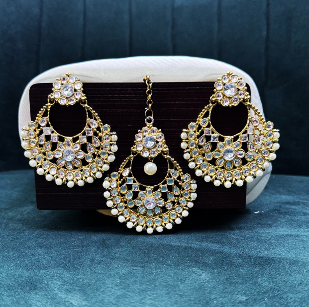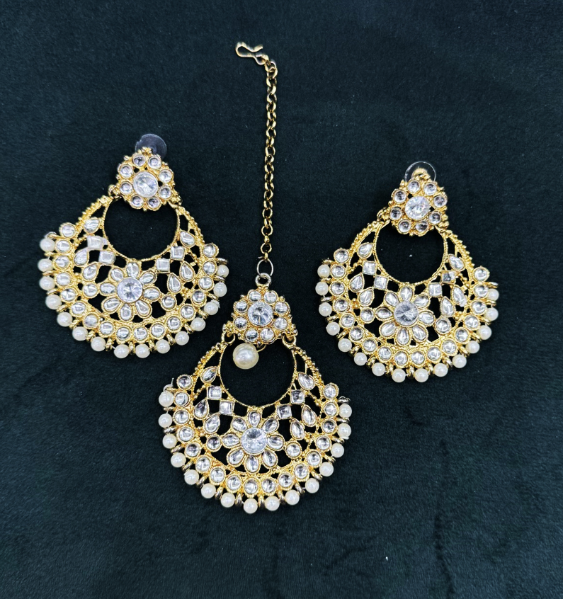 This exquisite earrings and maang tikka combo is a stunning blend of traditional artistry and contemporary elegance. Designed in a radiant crescent-shaped chandelier style, both the earrings and the tikka are adorned with dazzling white stones arranged in intricate floral and geometric motifs. The golden framework adds a rich, luxurious touch, while the delicate pearl drops along the edges lend timeless grace and charm. The maang tikka mirrors the design of the earrings perfectly, featuring a central floral element and a pearl drop that enhances the overall coordinated appeal, making this set ideal for weddings, festive occasions, or traditional celebrations.