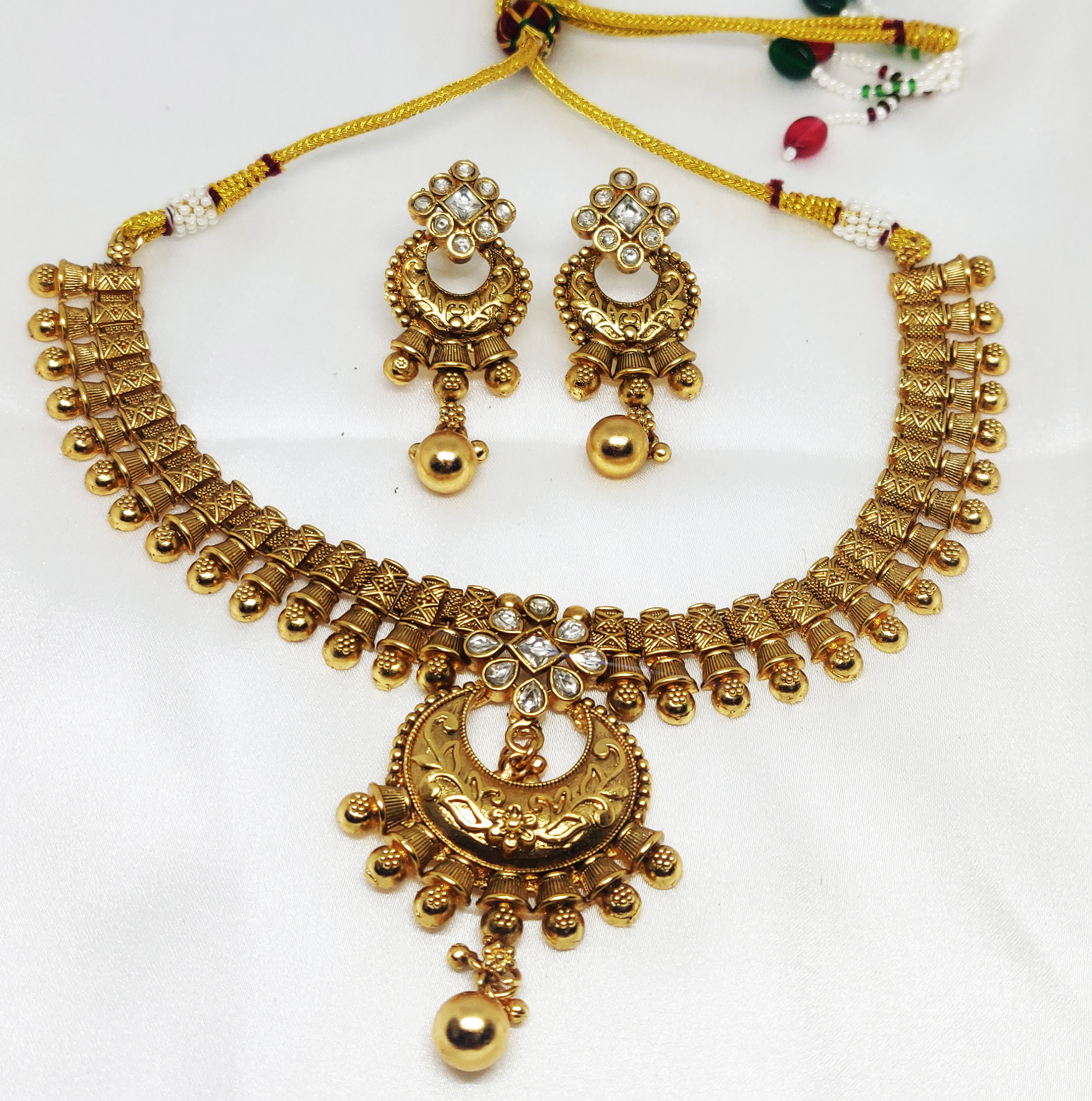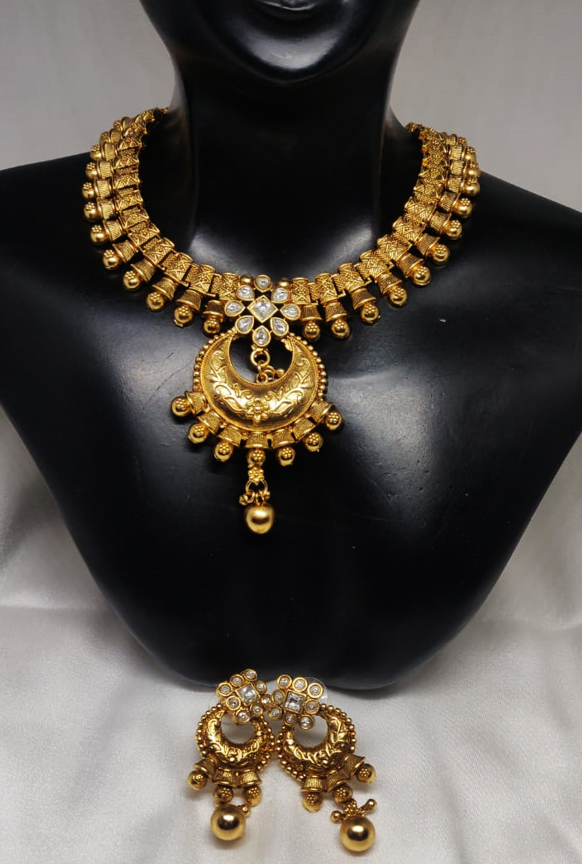 This ornate necklace set is a stunning example of traditional Indian temple jewelry. It features a broad gold-tone choker-style chain with intricate engravings and bead-like detailing along the edges. The central pendant is crescent-shaped with floral carvings and embellished with a cluster of sparkling white stones. The set includes matching earrings that echo the same aesthetic, combining intricate patterns, hanging beads, and a rich antique finish.