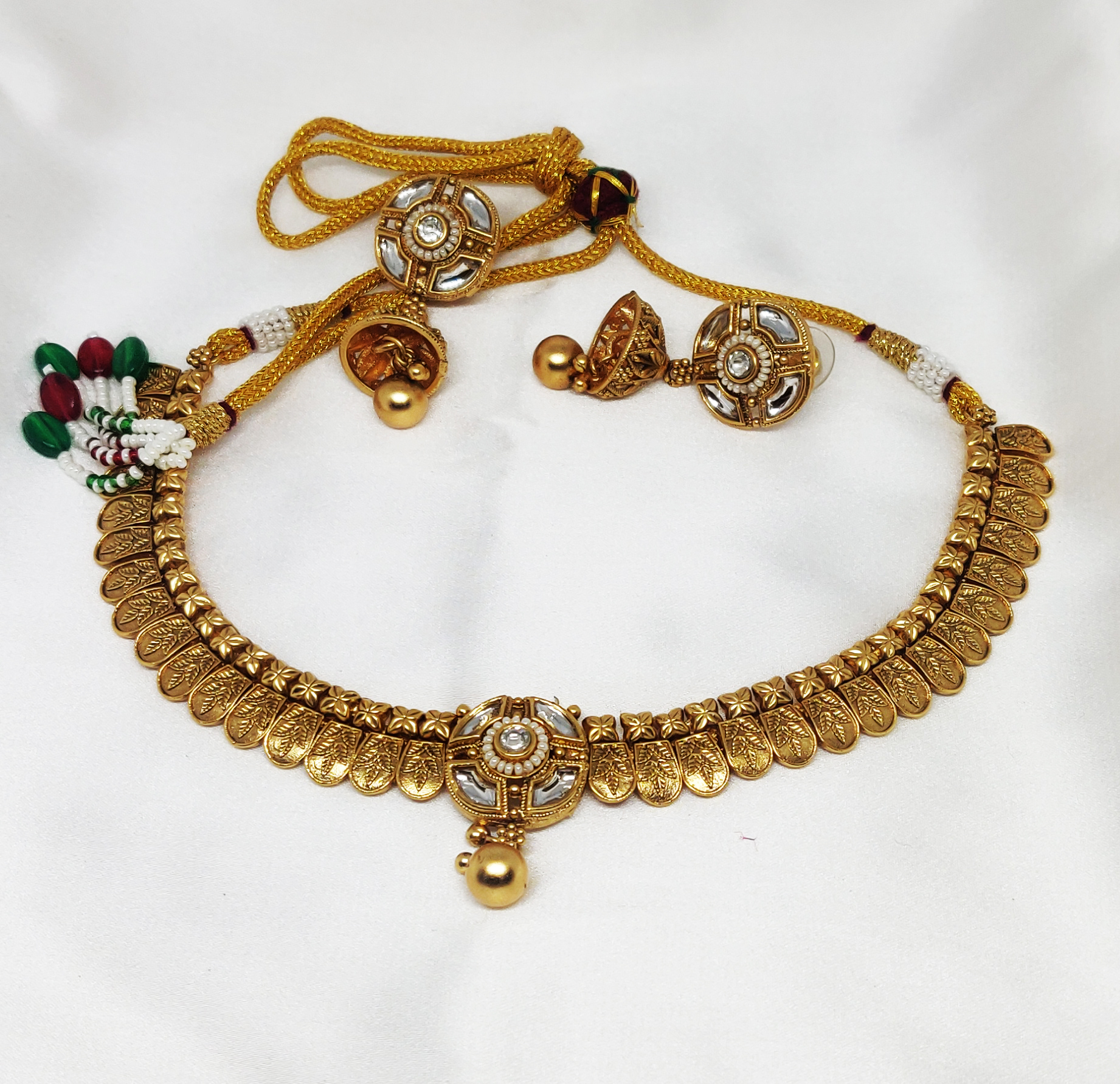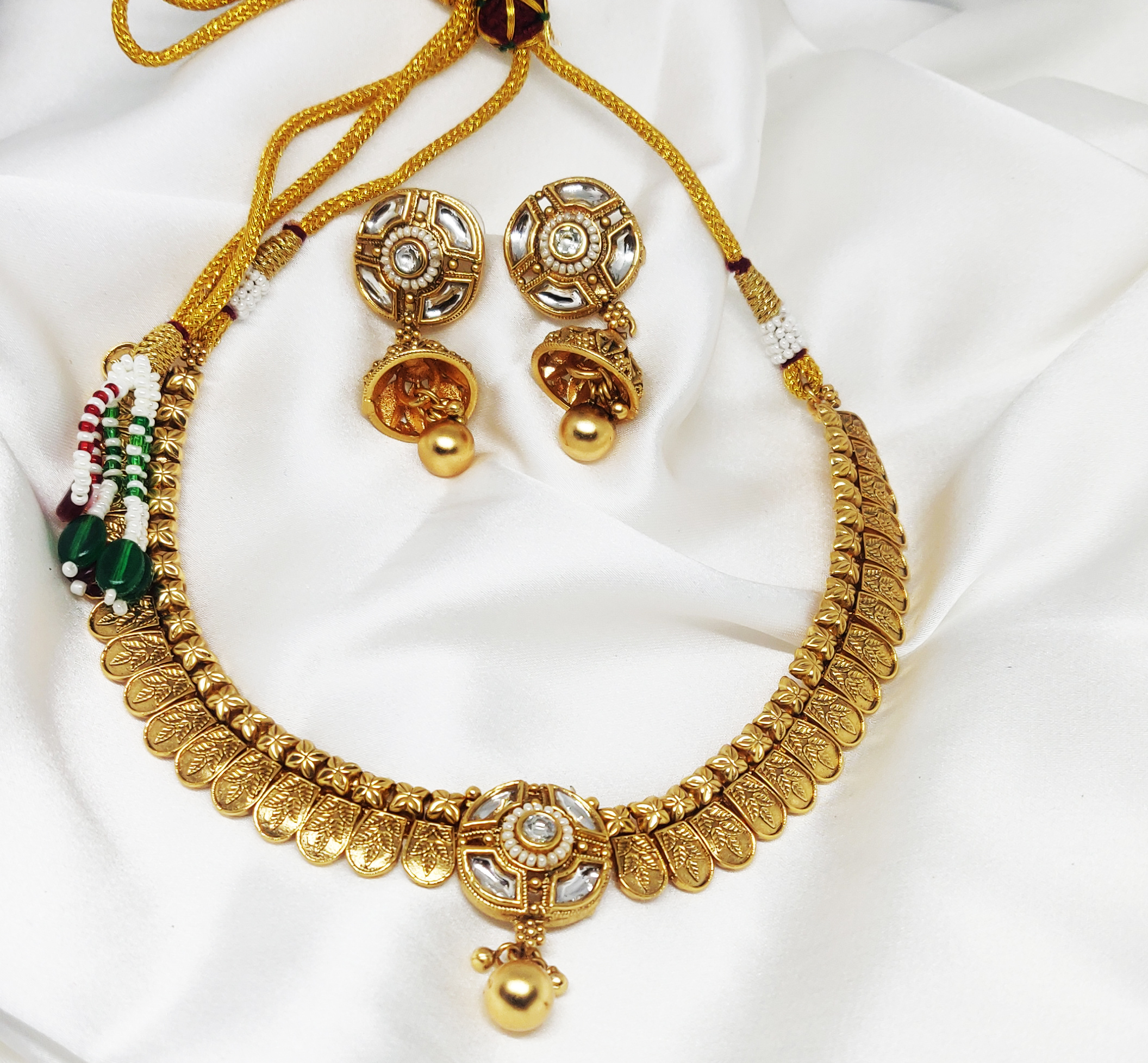 This traditional gold-tone necklace set features an antique-style design with intricate coin-like motifs that line the chain. The centerpiece is adorned with a round kundan-inspired medallion embedded with white stones, exuding elegance and timeless charm. Accompanied by a matching pair of earrings, this set blends temple jewelry aesthetics with subtle modern touches, perfect for those who appreciate rich cultural artistry.