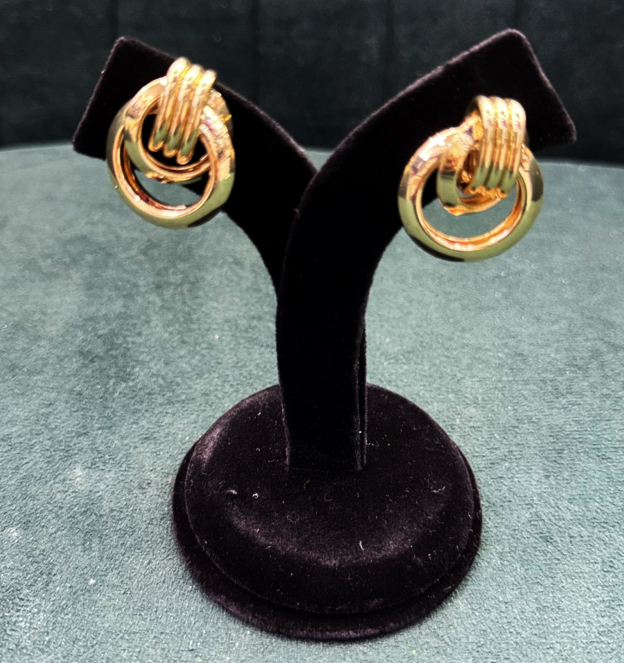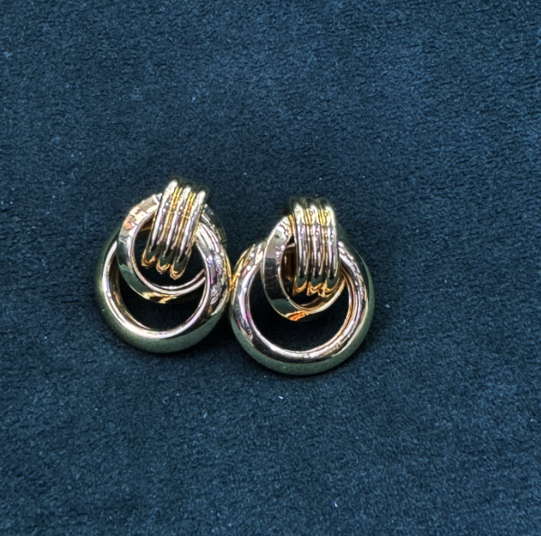 These bold gold-tone earrings feature a striking interlocking ring design, combining both structure and sophistication. The polished finish and layered hoop silhouette lend a modern twist to a classic motif, making them ideal for adding a touch of chic refinement to your accessory collection. The design evokes timeless elegance with a contemporary edge, perfect for both professional and social settings.