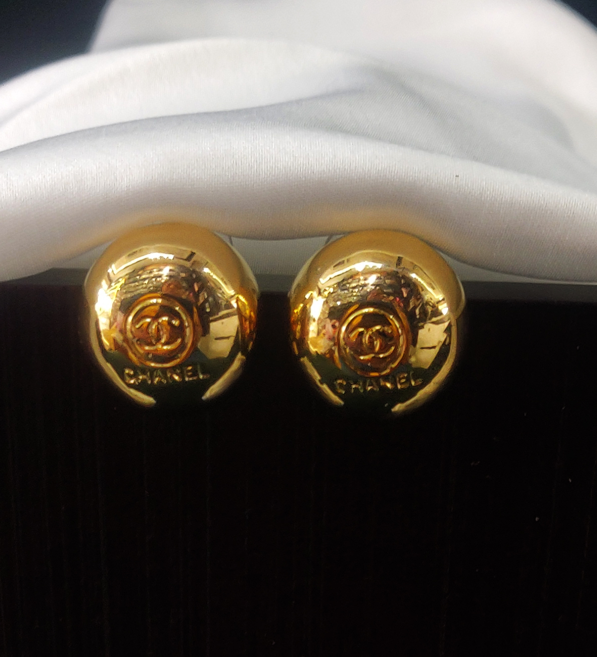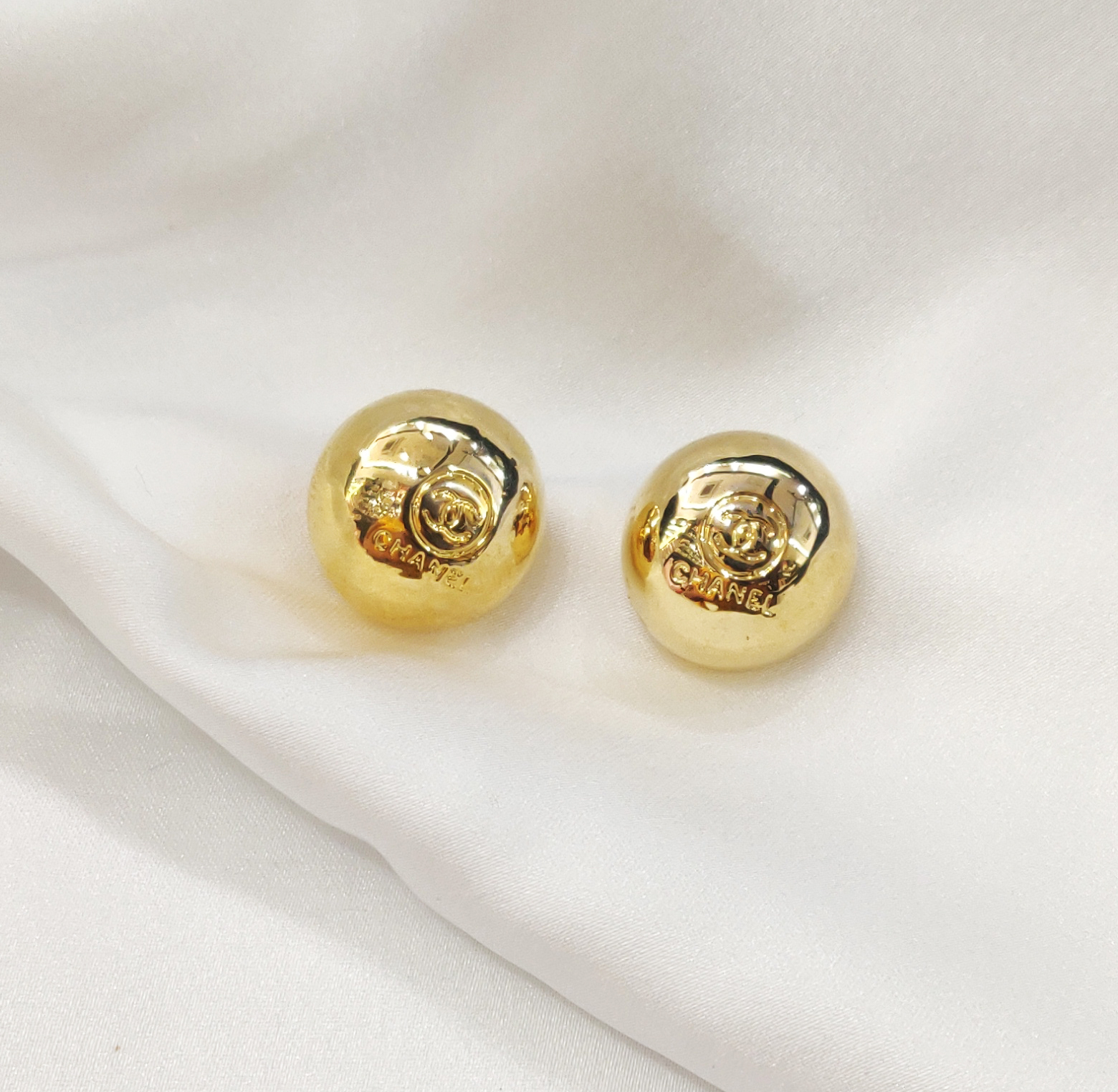 These elegant stud earrings feature a high-shine, gold dome design with a subtle embossed Chanel motif at the center, adding a refined and luxurious touch. The smooth, rounded shape and mirror-like finish create a timeless accessory that exudes sophistication and class. Lightweight and minimal, they make a bold statement while maintaining subtle elegance.