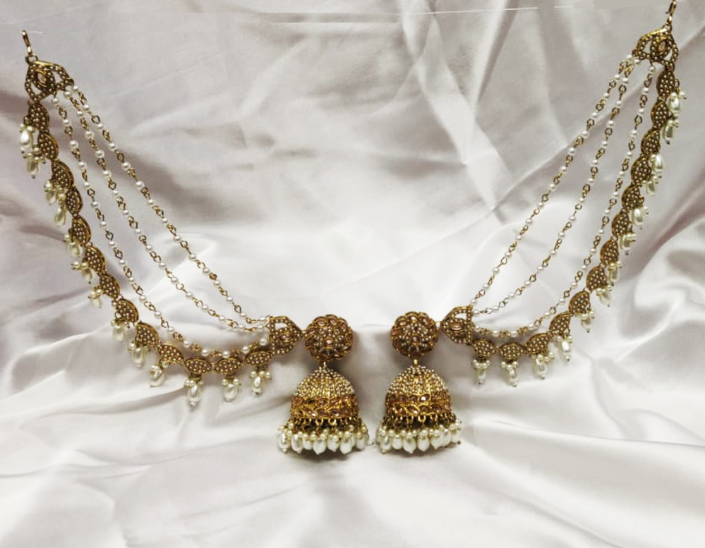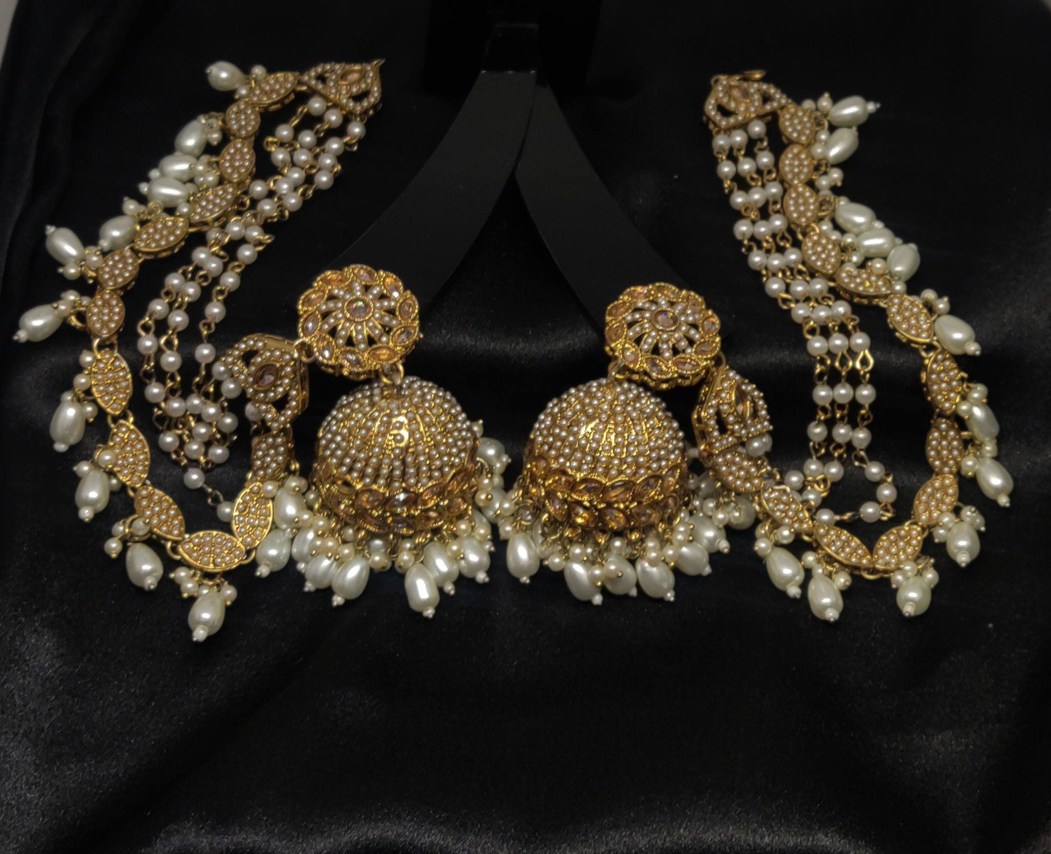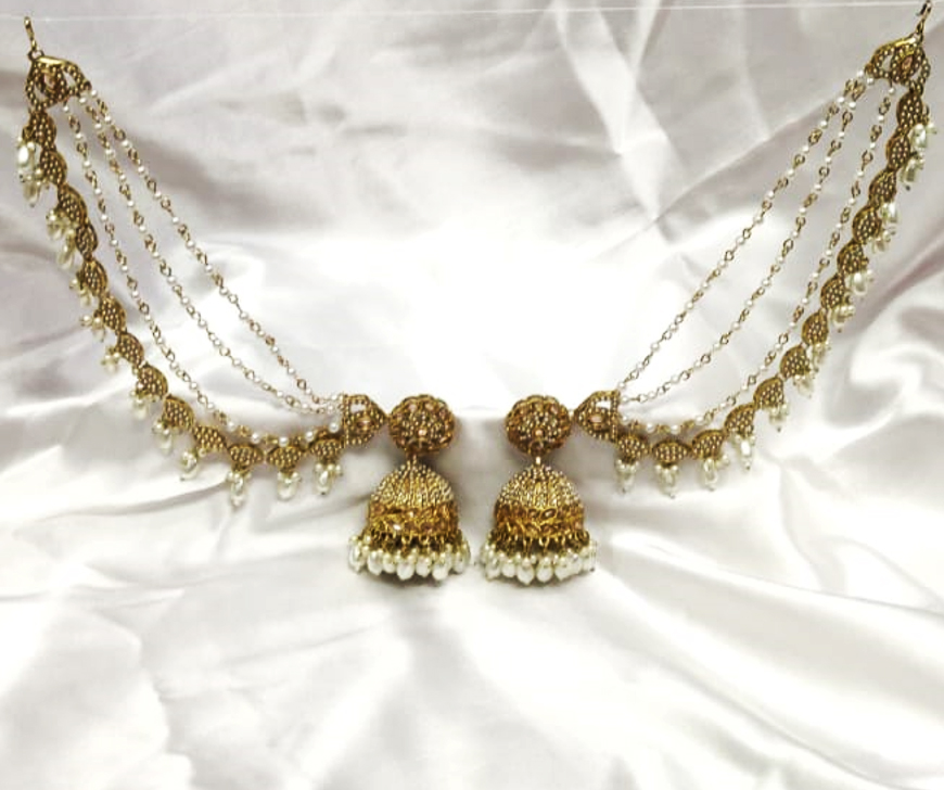 These exquisite earrings are traditional jhumar-style passa earrings featuring ornate double jhumkas with cascading pearl droplets, enhanced by three beautifully draped side chains. The golden filigree work on the domes is detailed and regal, while the chains adorned with pearls and mini motifs add a majestic, Mughal-inspired elegance. This head-jewelry-meets-earring style makes a bold, graceful statement, perfectly suited for bridal or festive occasions.