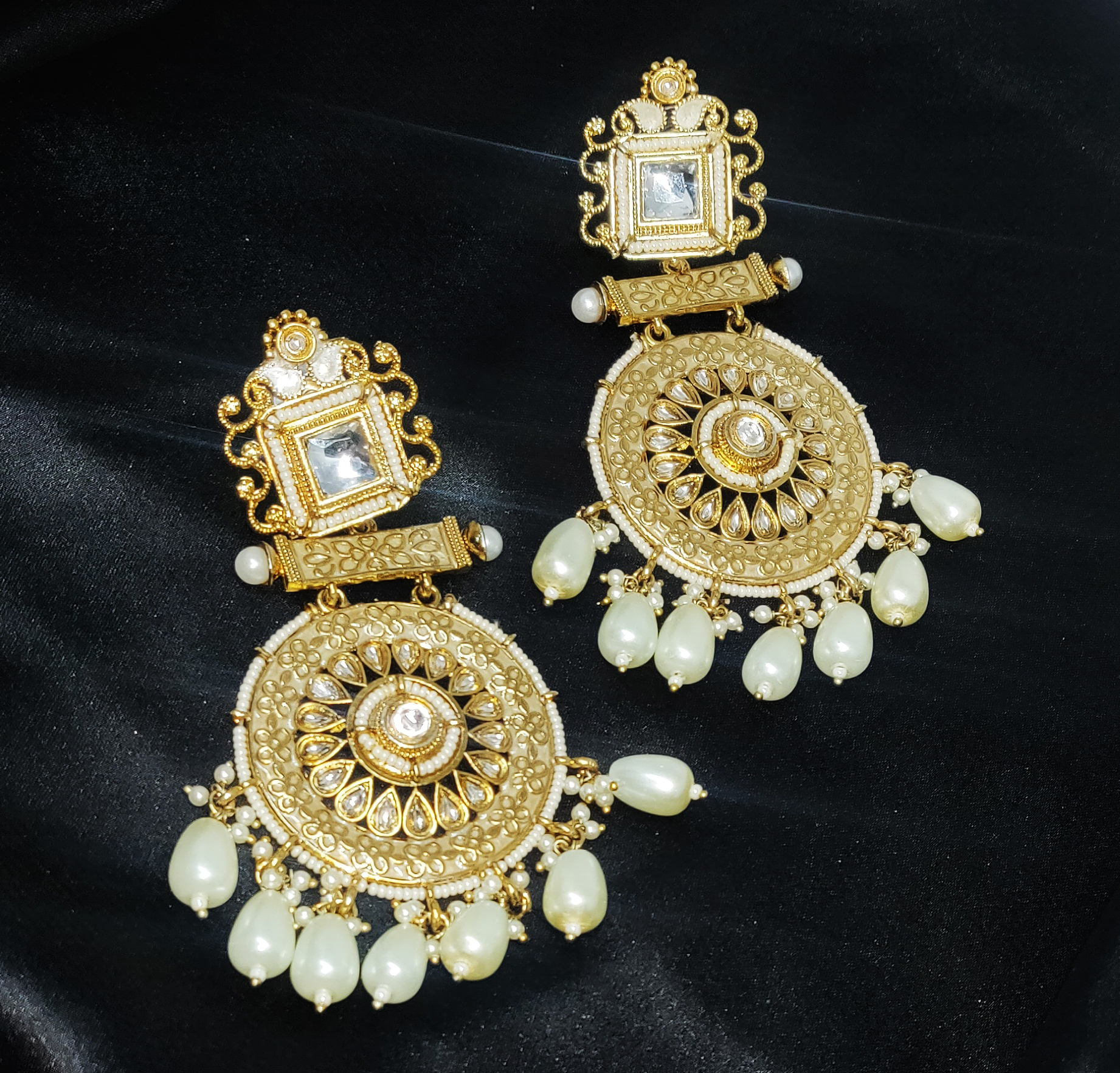 These stunning antique gold-tone earrings reflect a vintage aesthetic with intricate detailing and a unique architectural design. The top portion features a square motif with kundan embellishment, while the bottom circular element showcases delicate floral engraving surrounded by tear-drop stones. Dangling white pearl drops add an elegant finish, enhancing the traditional charm and movement of the piece.