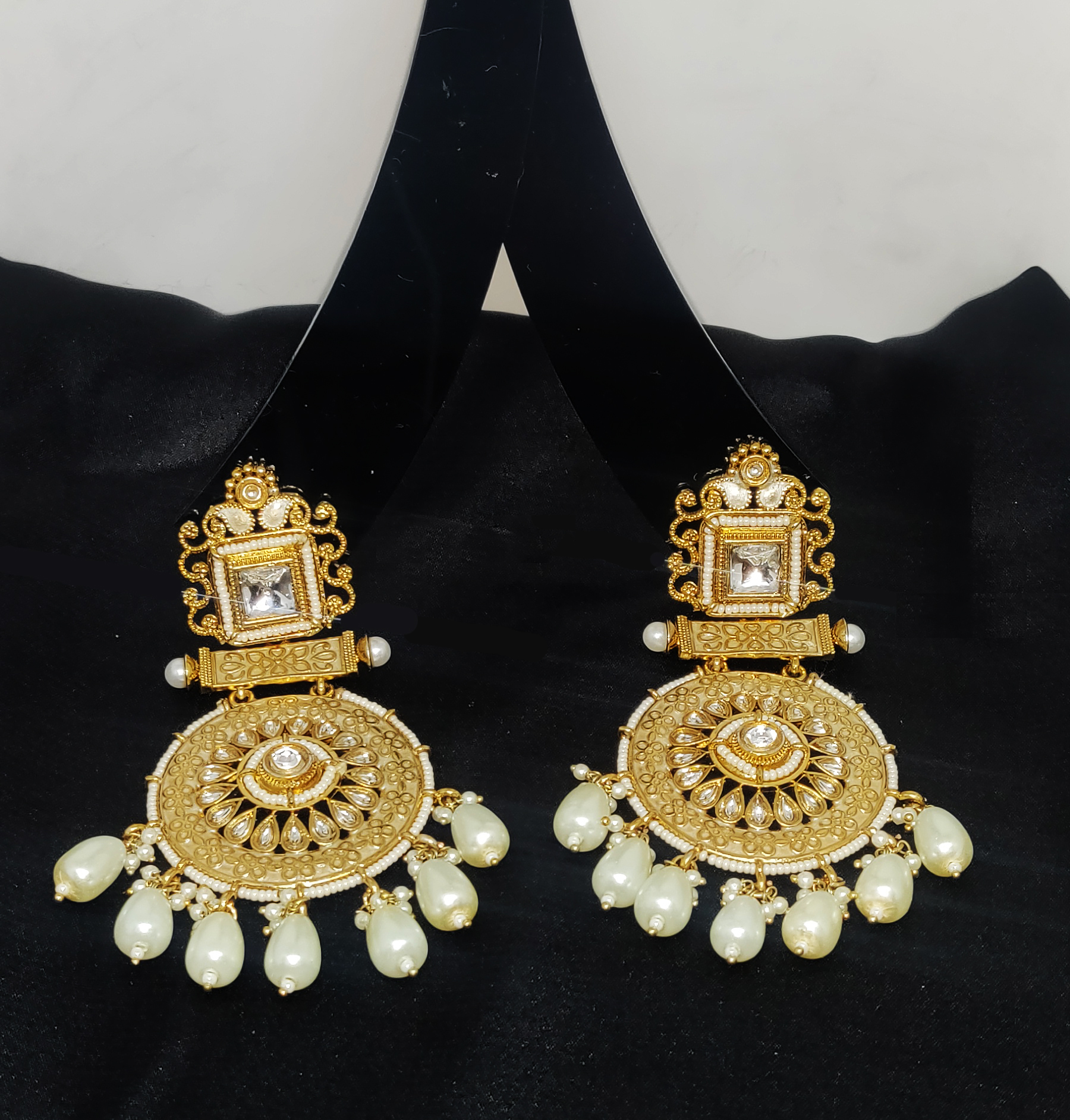 Perfect for festive occasions and ethnic celebrations, these earrings can be styled with sarees, silk suits, or lehengas in ivory, gold, or earthy tones. Opt for a classic bun or braid to draw attention to the intricate design. Since the earrings have a statement presence, pair them with minimalistic jewelry to maintain a balanced, regal look. They’re especially well-suited for sangeet nights, poojas, or even intimate wedding events.