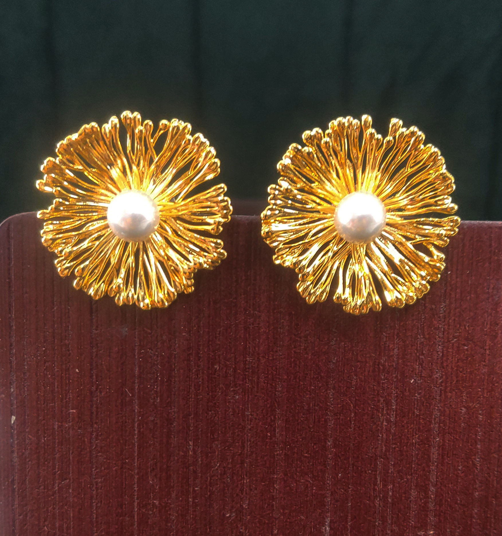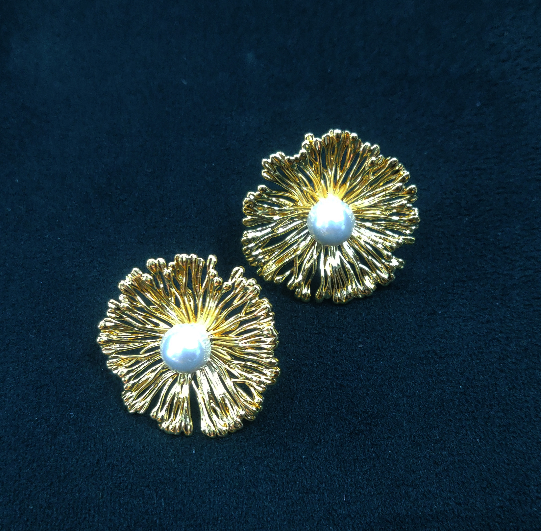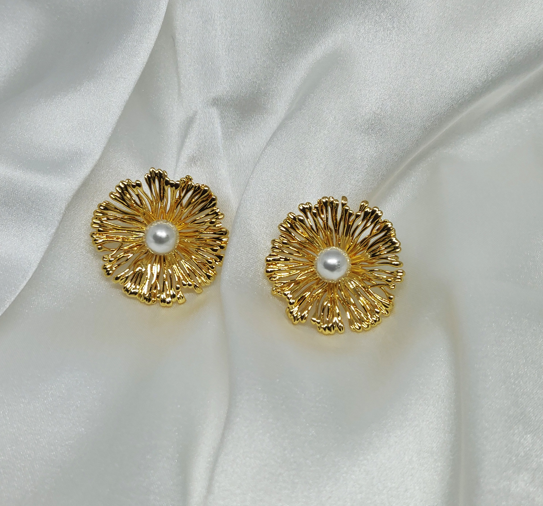 These radiant gold floral earrings are a true statement piece, crafted in a striking sunburst-like petal design. At the center sits a pristine pearl, adding a soft, elegant contrast to the bold gold finish. The intricate detailing of the petals gives the piece a dynamic, organic feel, resembling a blooming flower frozen in a moment of brilliance.