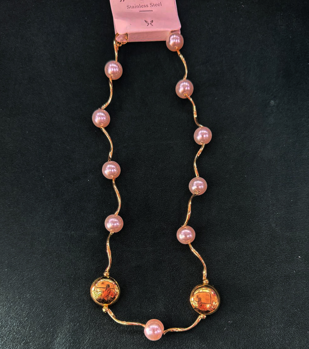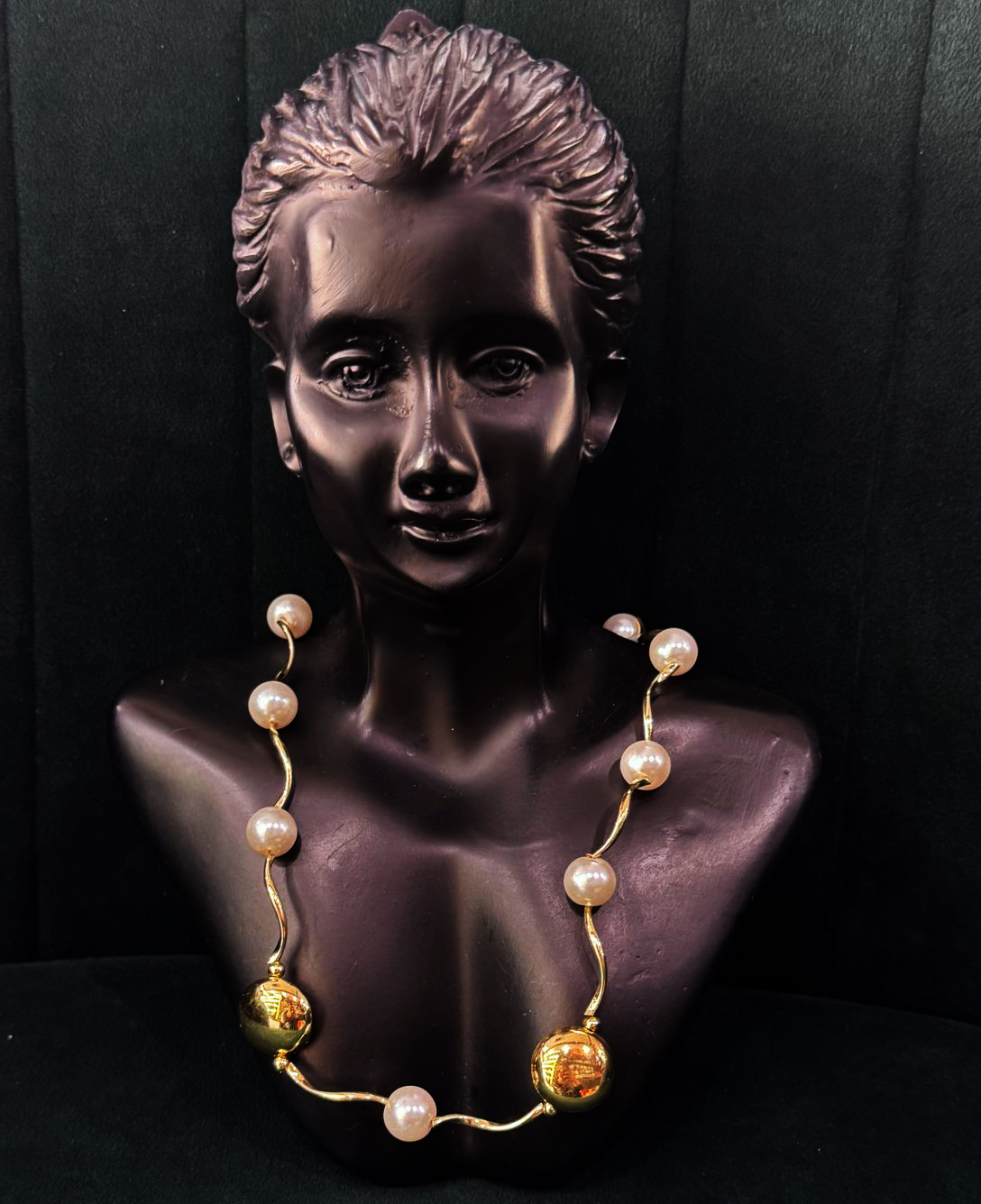 This necklace is a graceful blend of timeless elegance and contemporary flair, featuring alternating luminous pearls and bold golden orbs strung along a gently curving gold-toned chain. The interplay of soft, creamy textures with the metallic shine creates a balanced and sophisticated look, making it a statement piece that doesn’t overpower. Its sculptural arrangement flows effortlessly, enhancing the neckline with a touch of modern royalty.