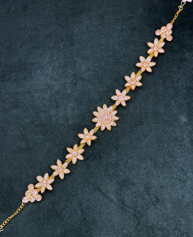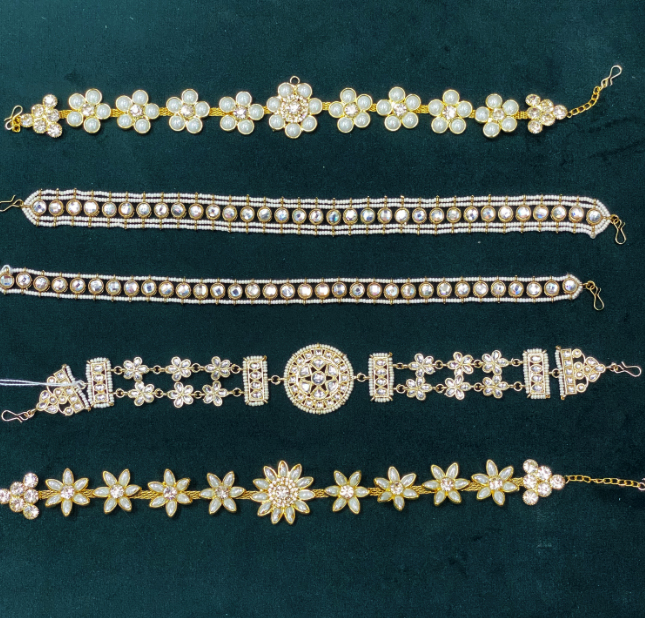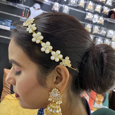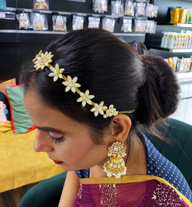 This elegant matha patti features a stunning row of floral motifs, each designed with white stones and gold accents that give a radiant, festive charm. The symmetrical daisy-like flowers sit gracefully across the hairline, offering a soft yet regal look. The piece is lightweight and adjustable, making it suitable for both simple hairstyles and intricate bridal buns.