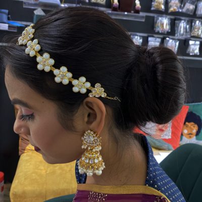 Perfect for weddings, mehendi functions, or festive celebrations, this floral matha patti pairs beautifully with lehengas, sarees, or even Indo-western fusion outfits. For a classic bridal touch, combine it with matching Kundan or pearl earrings and a bold lip. Keep your hairstyle sleek—like a center-parted bun or soft waves—to highlight the matha patti’s design. Avoid heavy forehead embellishments with this piece, as its floral detailing is a statement in itself.
