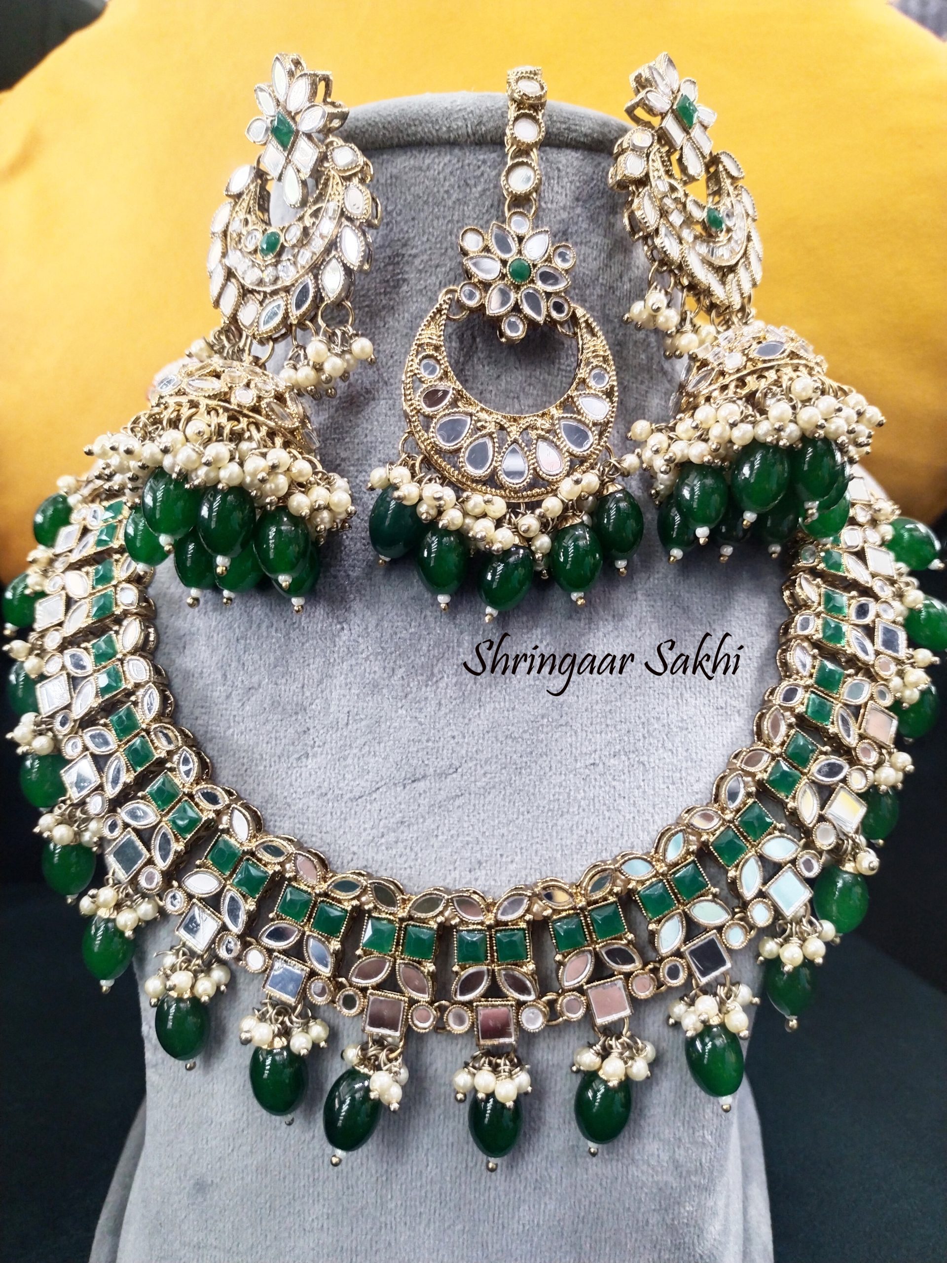 This opulent jewellery set features a grand choker-style necklace and matching earrings and maangtikka crafted in traditional mirror work. The design showcases an elegant blend of green stones, mirror-polished glass pieces, and lustrous pearl hangings, set in antique gold-finish metal. The intricate craftsmanship and luxurious details make it a show-stopping piece perfect for festive or bridal occasions.