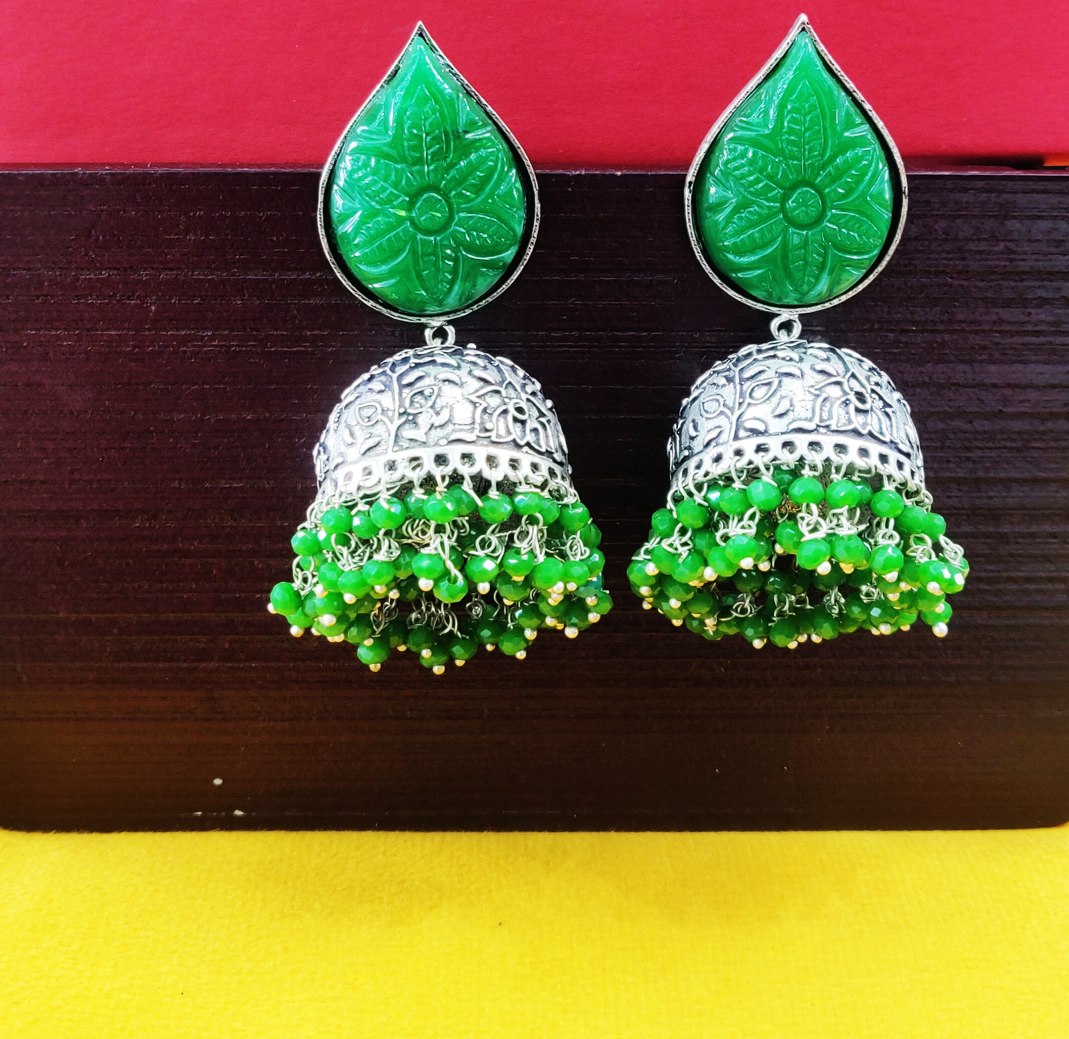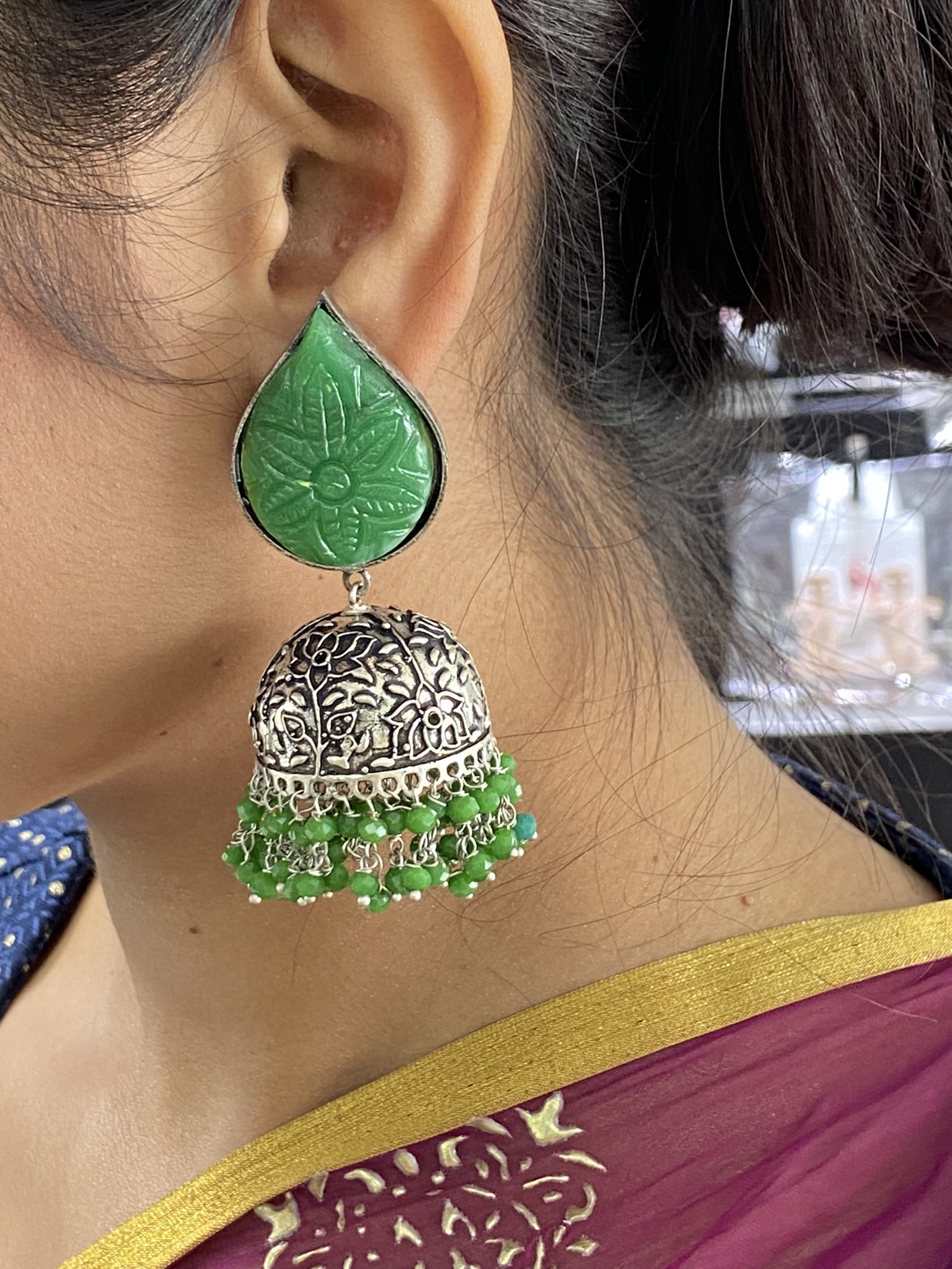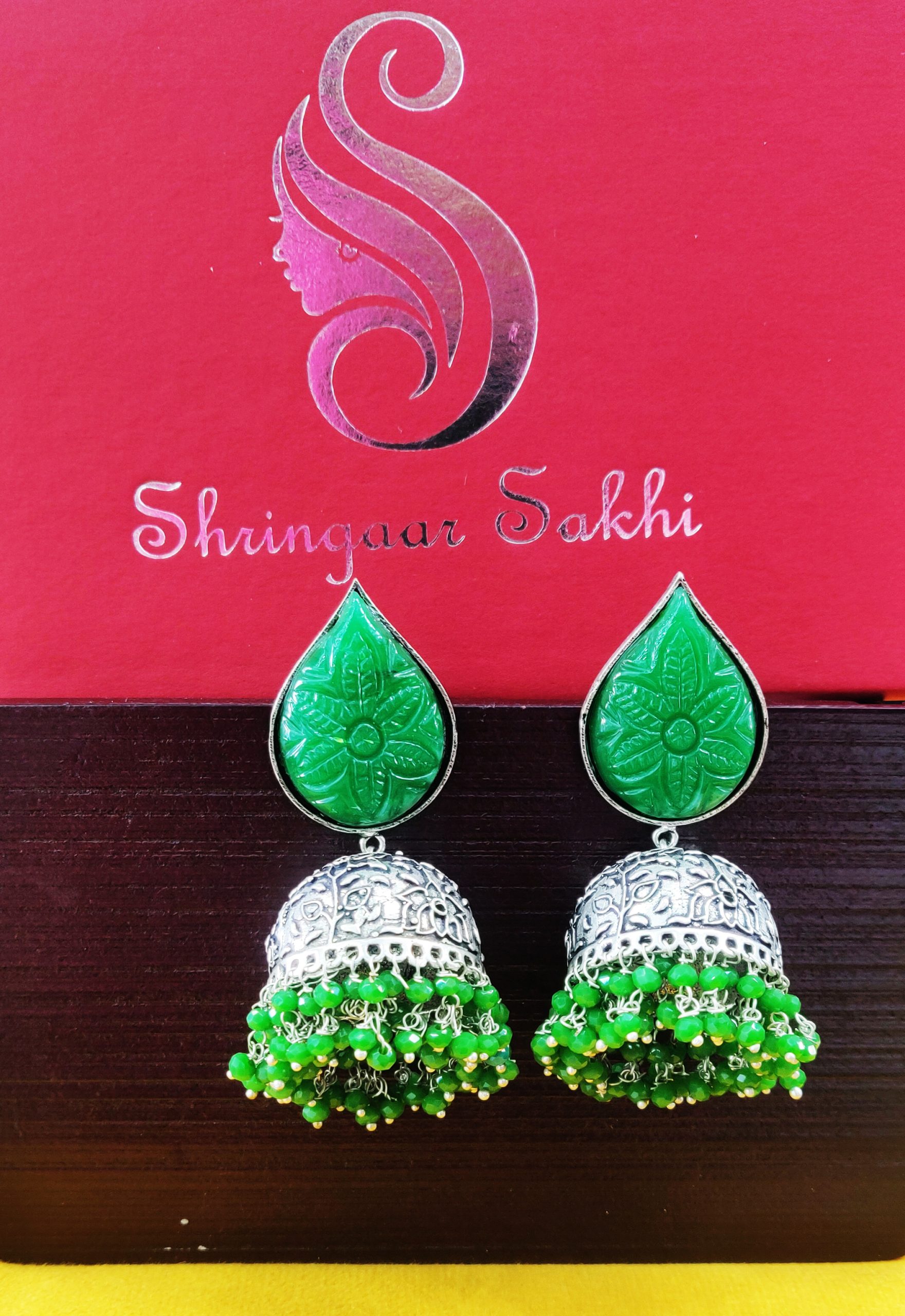 This silver look alike jhumki style earring is molded from brass and studded with green carving stones and pearls.