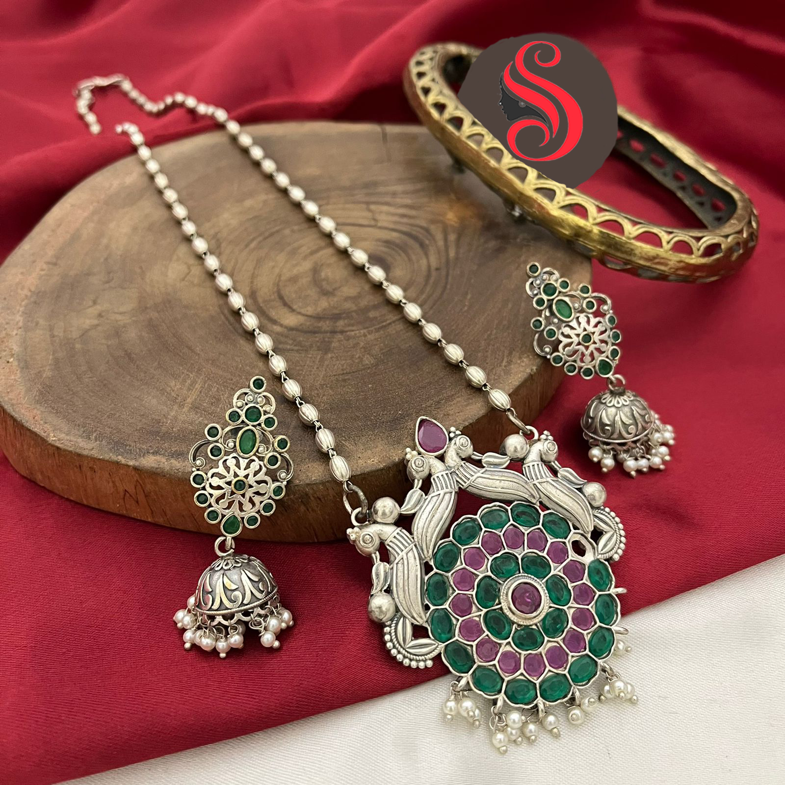 Oxidized silver-plated necklace with beautiful pendant has green and ruby stone-studded details secured with a drawstring closure.