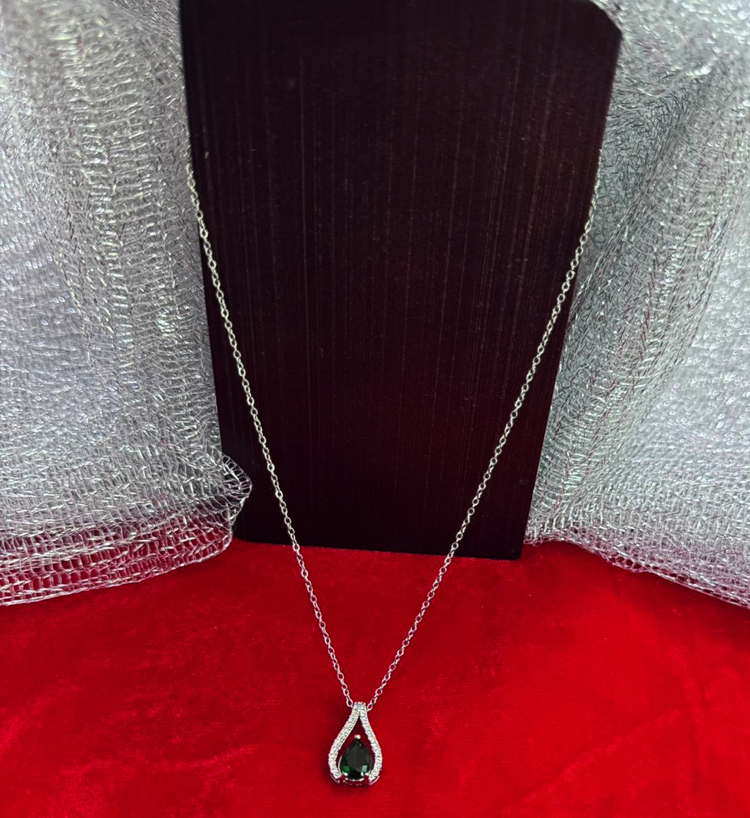 This elegant pendant necklace features a teardrop-shaped design that captures classic sophistication with a modern twist. The centerpiece is a deep green gemstone encased in a shimmering silver-tone frame embellished with tiny white stones, giving it a refined sparkle. Suspended from a delicate chain, this timeless piece is lightweight, versatile, and perfect for adding a graceful touch to your jewelry collection.